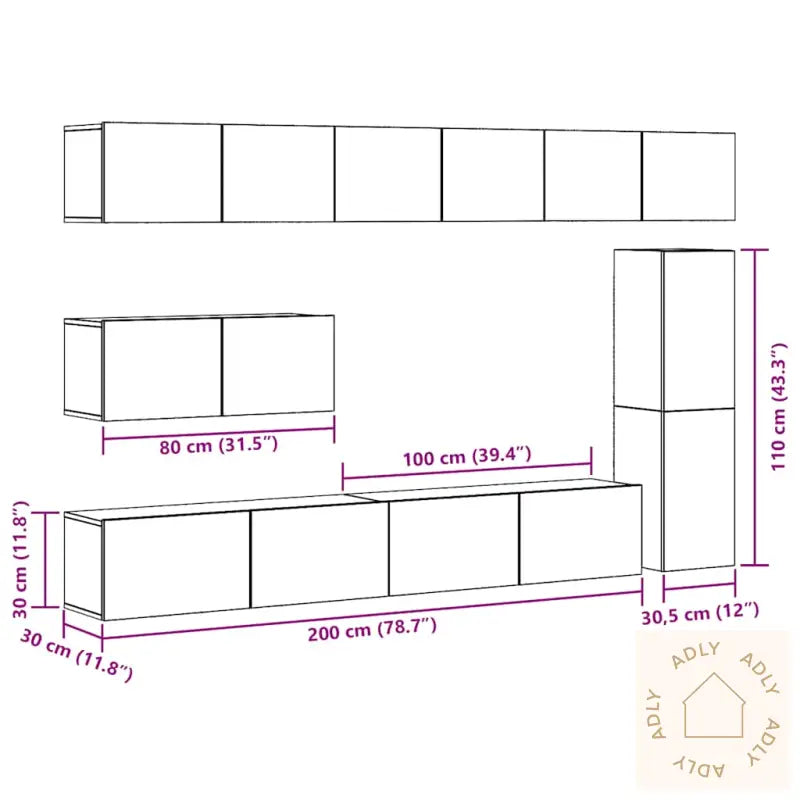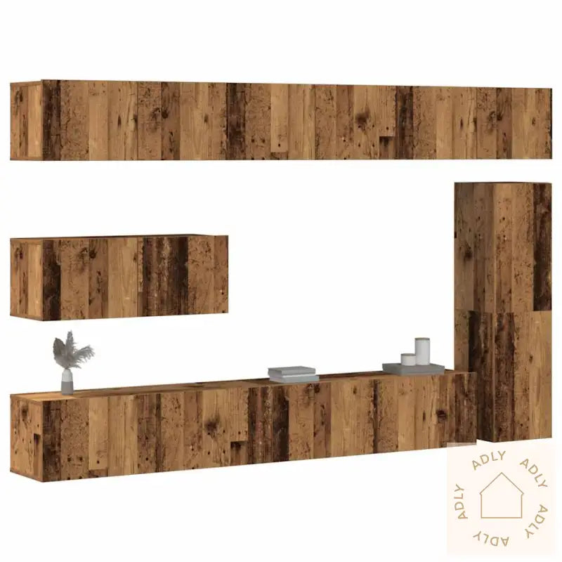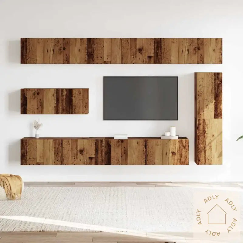 Skruer og plugger for veggmontering følger ikke med. For best resultat anbefales det å bruke riktig type festemidler for akkurat din veggtype – rådfør deg gjerne med fagfolk dersom du er usikker. Husk å lese og følge monteringsanvisningen nøye.Farge: gammelt treMateriale: konstruert treMontering kreves: jaLeveransen inneholder:1 x TV-benk: 30,5 x 30 x 110 cm (B x D x H)4 x TV-skap: 80 x 30 x 30 cm (B x D x H)2 x TV-skap: 100 x 30 x 30 cm (B x D x H)