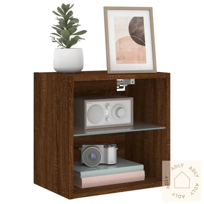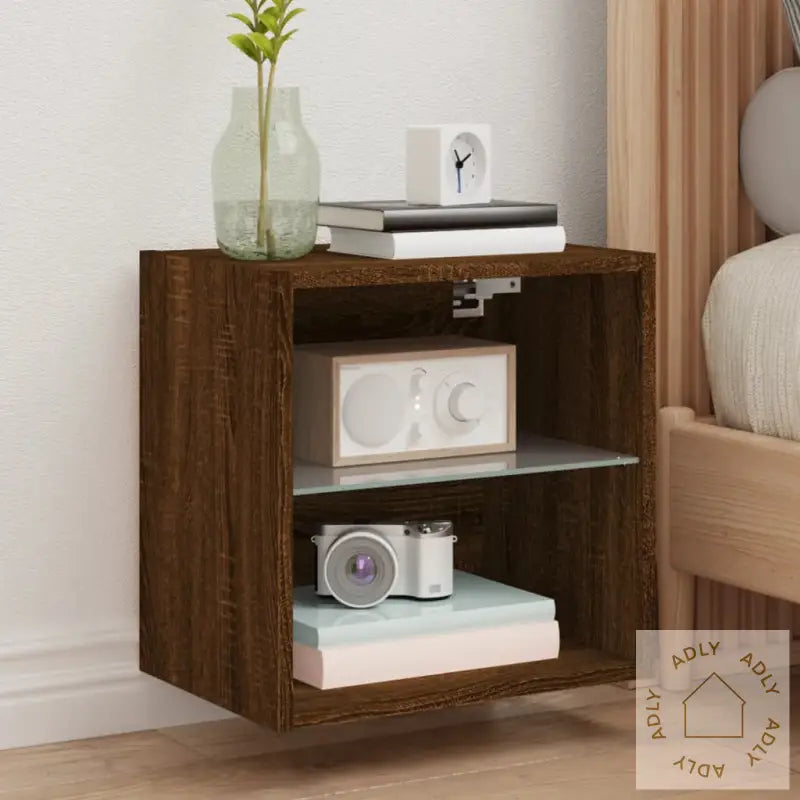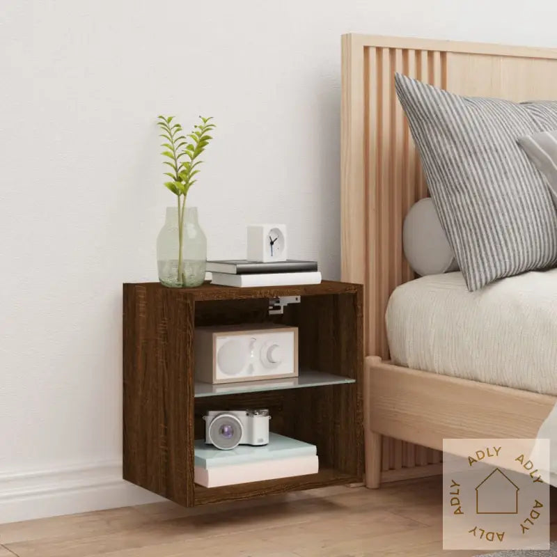 Skruer og plugger til veggmontering følger ikke med, og det anbefales å velge festemidler som passer akkurat til veggtypen din. Ta kontakt med fagfolk hvis du er usikker og følg alltid monteringsanvisningene nøye.Nattbordet er utstyrt med USB-kontakt for RGB led-lys – husk at du trenger en sertifisert 5V USB-strømkilde (følger ikke med).Farge: brun eikMaterialer: konstruert tre, glassMål: 40 x 28,5 x 40 cm (L x B x H)Montering kreves: ja