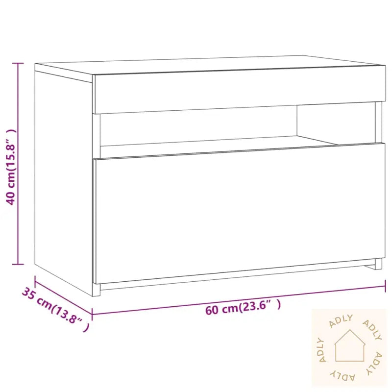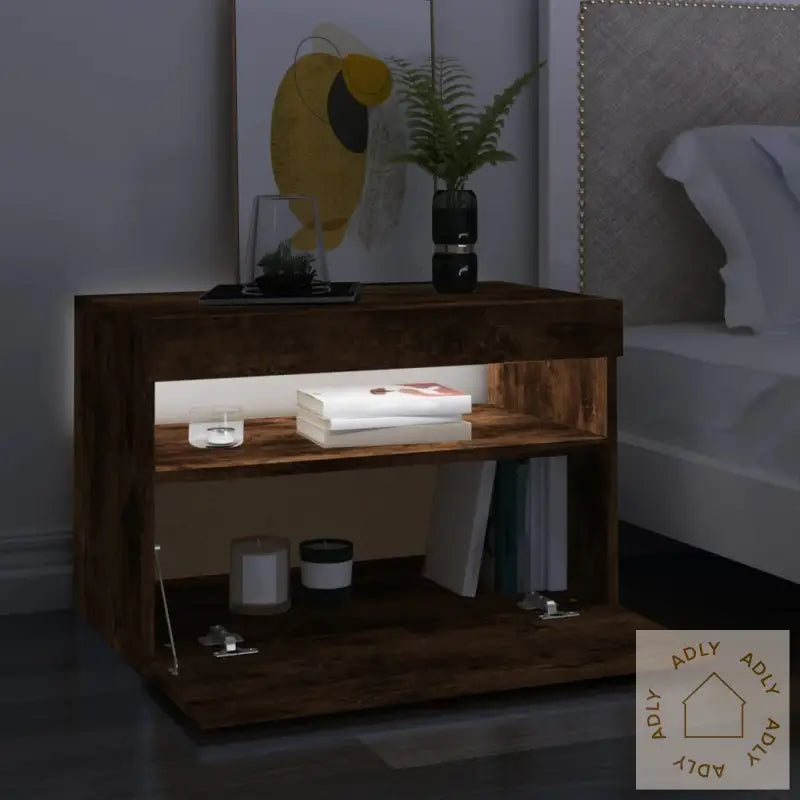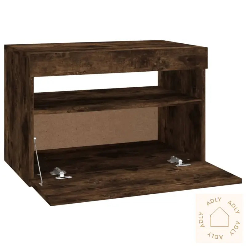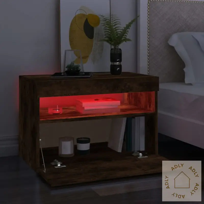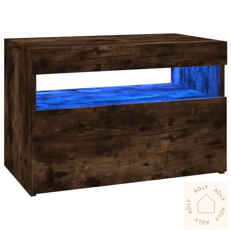 Produktet leveres med USB-kontakt for LED lys, men husk at 5V USB-strømkilde må kjøpes separat.Farge: røkt eikMateriale: konstruert treMål: 60 x 35 x 40 cm (L x B x H)Med RGB LED-lysMontering kreves: ja