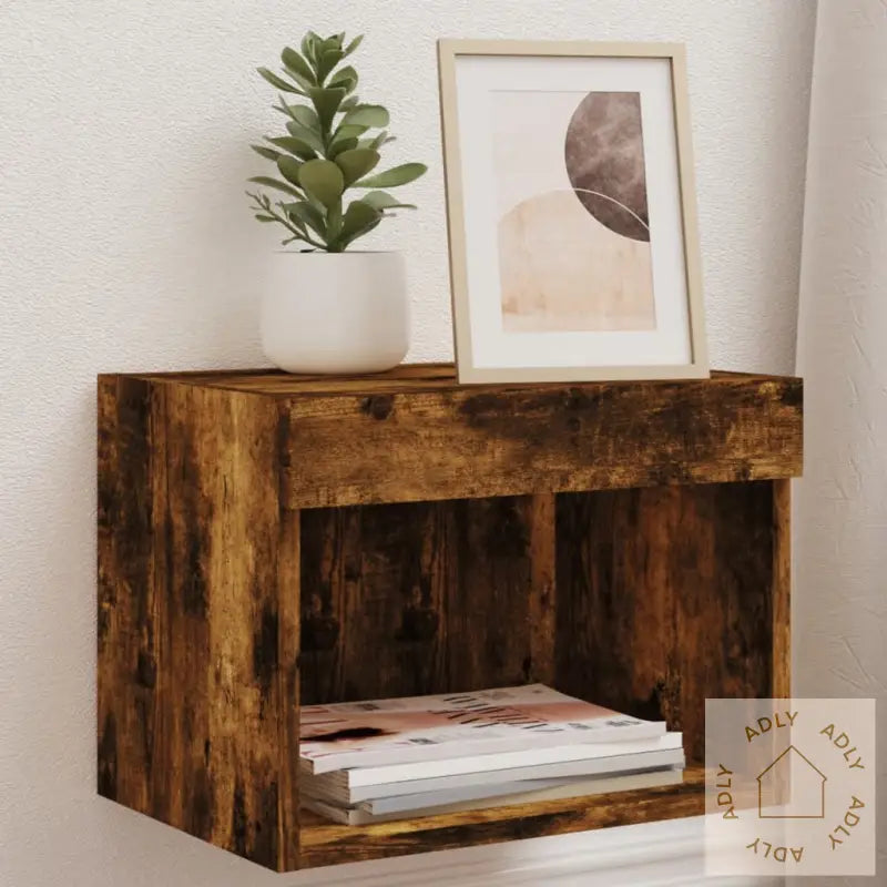 Skruer og plugger for veggmontering følger ikke med. Velg skruer og plugger som passer til akkurat dine vegger, og kontakt gjerne en fagperson ved usikkerhet. Følg monteringsanvisningen nøye.Produktet har en USB-kontakt og trenger en 5V USB-strømkilde (ikke inkludert). Pass på at du bruker en sertifisert lader for sikker drift av RGB LED-lysene.Farge: røkt eikMateriale: konstruert treMål: 40 x 30 x 30 cm (L x B x H)Montering kreves: ja