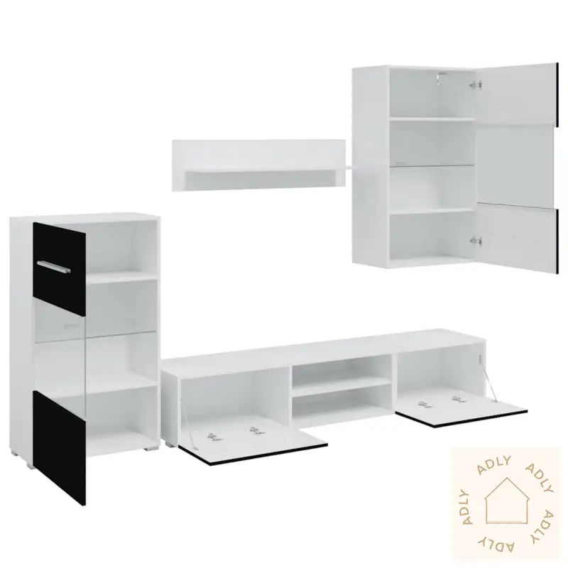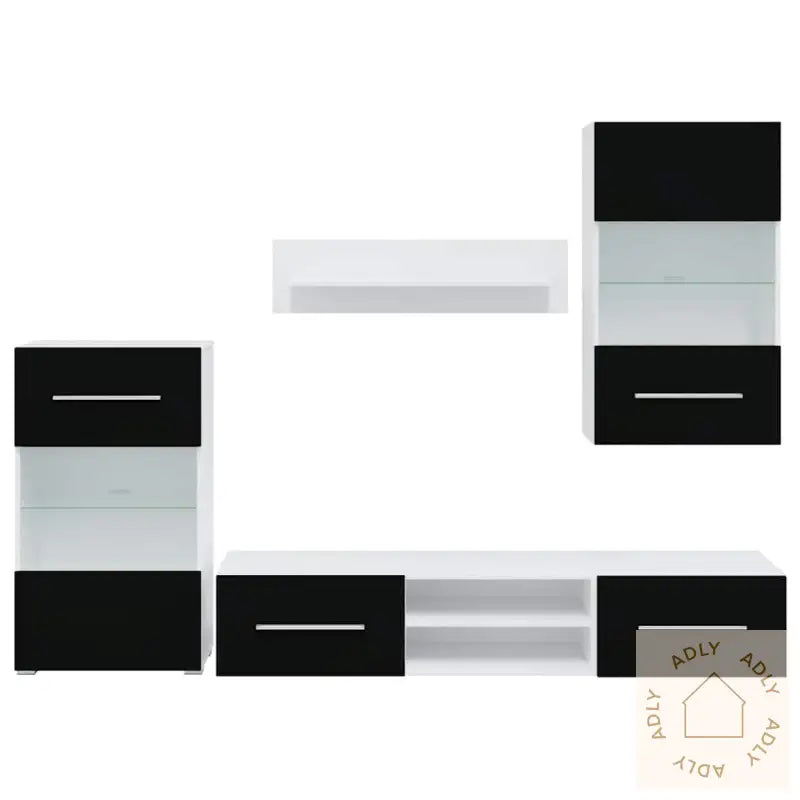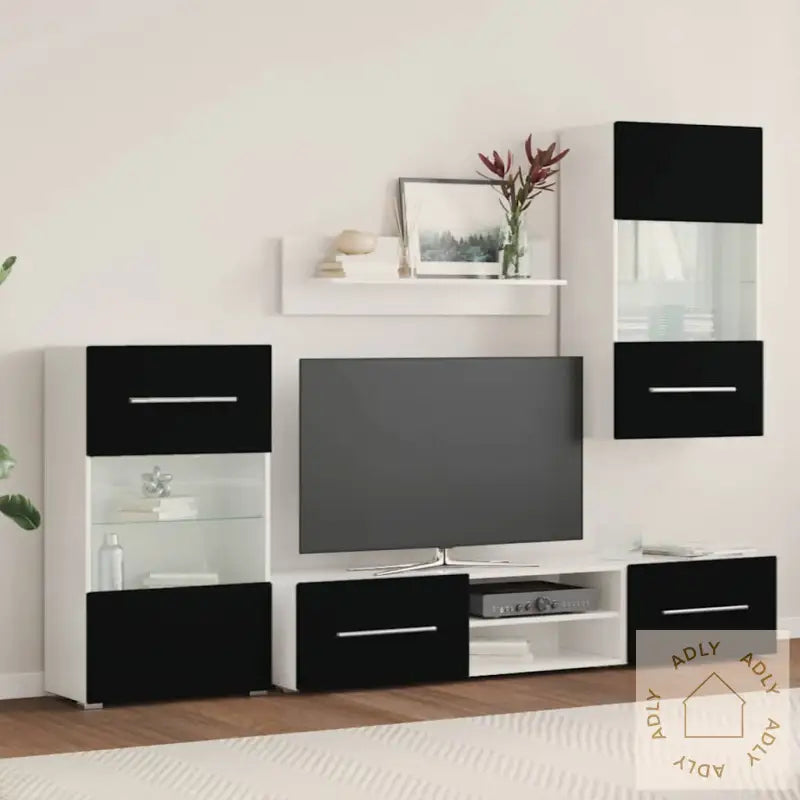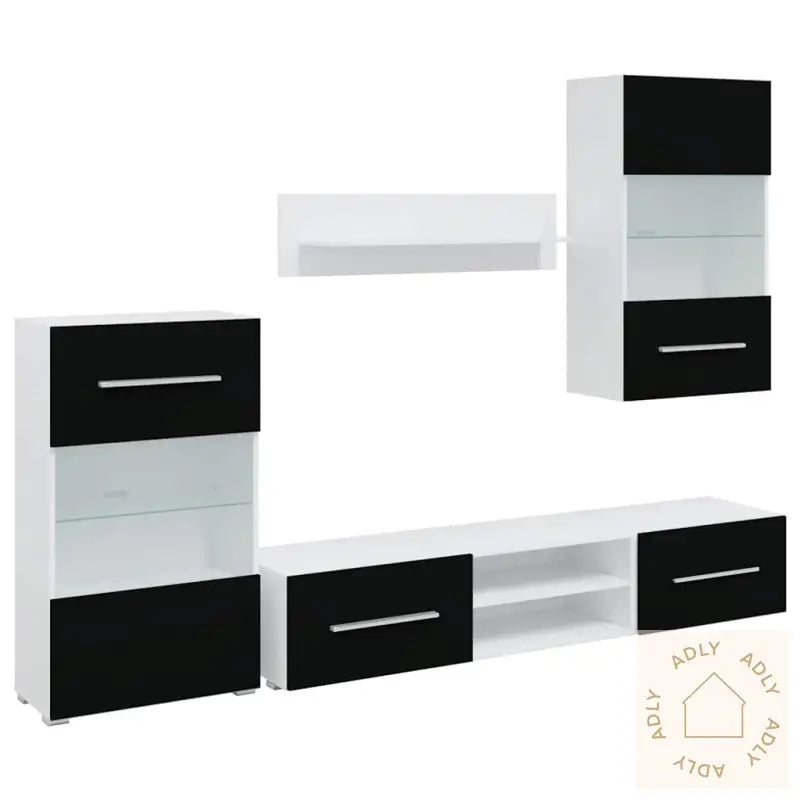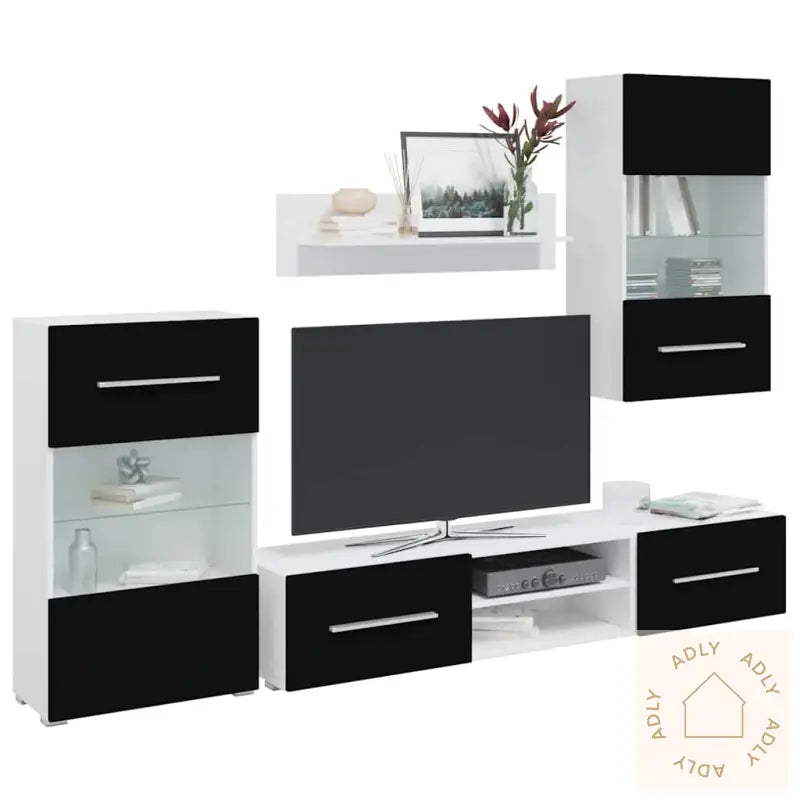 Stabilt og slitesterkt materiale: Settet er produsert i konstruert tre – kjent for å være robust, formstabilt og motstandsdyktig mot fukt, vridning og sprekker. Det gir deg langvarig kvalitet, noe som gjør møbelet til et smart valg når du vil ha både slitestyrke og eleganse hjemme.Rikelig med lagringsplass: Oppbevaringsmulighetene er mange med veggskap, stående skap, to lowboards og en praktisk vegghylle. Det gir deg god plass til alt fra multimedieenheter og bøker til pyntegjenstander – perfekt for deg som vil ha orden uten å ofre stil.Moderne estetikk: Det slanke designet i matt svart, kombinert med glatte overflater og sofistikerte detaljer, gjør at møblene enkelt matcher ulike interiørstiler og tilfører rommet et friskt, moderne uttrykk.Forbedret funksjonalitet: TV-skapene har nedtrekksdører som skjuler rotet og gir en ryddigere look. Vegg- og stående skap har delvis glaserte dører, pluss glasshylle med energieffektiv LED-belysning – noe som både gir bedre oversikt og et eksklusivt preg til oppbevaringen.Plassbesparende design: Smart design sørger for at du får maksimal utnyttelse av plassen, enten du har liten eller stor stue. Settet gir deg fleksibel oppbevaring uten at rommet føles trangt – en ideell løsning for moderne livsstil der det er viktig å ikke ofre stil for funksjonalitet.Godt å vite: