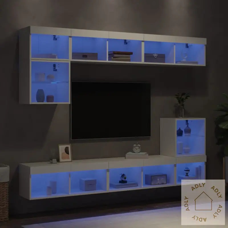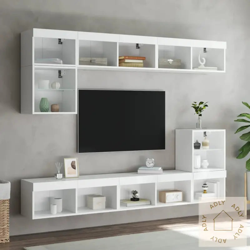 RGB LED-lys: For en ekstra moderne følelse har TV-enhetene innebygde RGB led-lys. Lysene har flere innstillinger, slik at du kan justere fargene etter eget humør og stil. Du kan enkelt bytte mellom ulike lyseffekter og la lysene skifte automatisk for å skape stemning i rommet, og samtidig gi veggskapene et trendy og unikt preg.