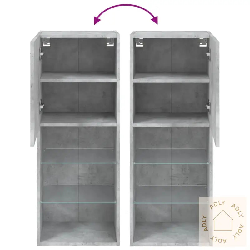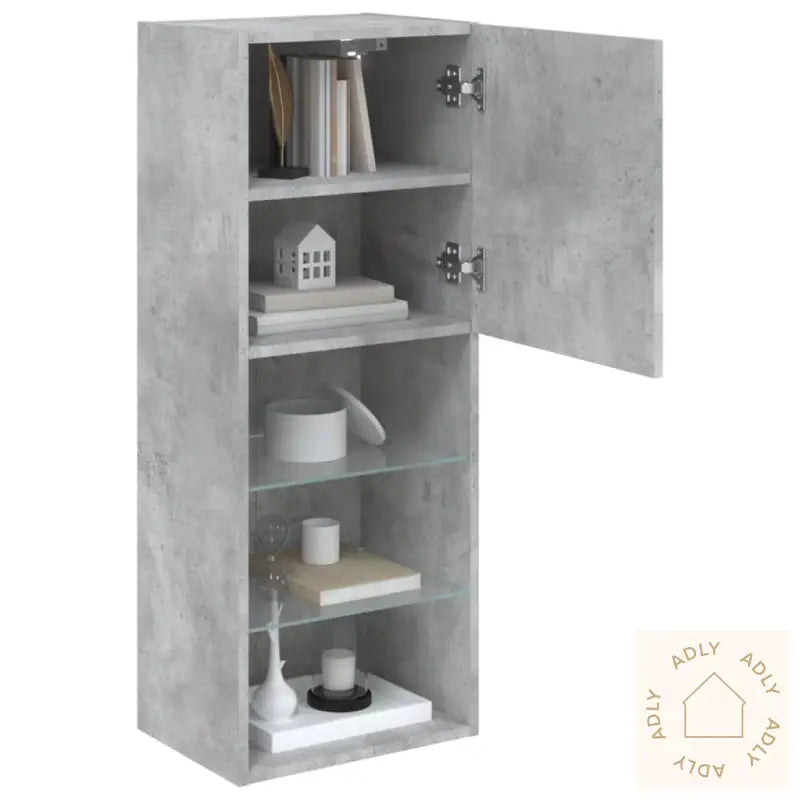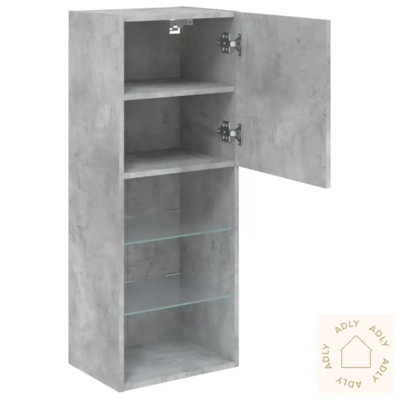 Skruer og plugger for veggmontering følger ikke med, så vi anbefaler å velge løsninger som passer akkurat dine vegger. Rådfør deg gjerne med en fagperson om du er usikker, og følg monteringsanvisningene nøye for best resultat.Produktet har USB-kontakt og krever en sertifisert 5V USB-strømkilde (ikke inkludert).Farge: betonggråMateriale: konstruert tre, glassMål: 40,5 x 30 x 102 cm (L x B x H)Montering kreves: jaMed sin kombinasjon av slitesterke materialer, smarte funksjoner som RGB LED-lys og moderne design, passer denne TV-benken perfekt inn med ulike møbler til hjemmet og løfter tv-stua til et nytt nivå.