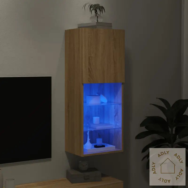 Det konstruerte treverket gir TV-benken en glatt overflate, samtidig som det sikrer holdbarhet, stabilitet og fuktmotstand – ideelt for møbler til hjemmet som skal vare lenge. Glassdetaljer løfter designet og gjør at den ser eksklusiv ut.TV-benken tilbyr god lagringsplass, slik at du enkelt kan organisere DVD-spillere, mottakere, disker og annet utstyr, mens du holder alt innen rekkevidde og området rundt TV-en ryddig.Underholdningssenteret er utstyrt med RGB LED-lys som du kan tilpasse etter humør, filmkveld eller fest – velg mellom forskjellige lysfarger og effekter direkte via den medfølgende menyen. Dette gir rommet en spennende stemning og gjør TV-benken til et naturlig blikkfang når du inviterer venner eller familie på besøk.Den veggmonterte løsningen frigjør gulvplass, noe som gjør det lettere å holde rent og gir en luftigere følelse i rommet. Samtidig får du ekstra lagringsplass uten å miste romfølelsen, noe mange ønsker fra moderne møbler til hjemmet.Godt å vite: