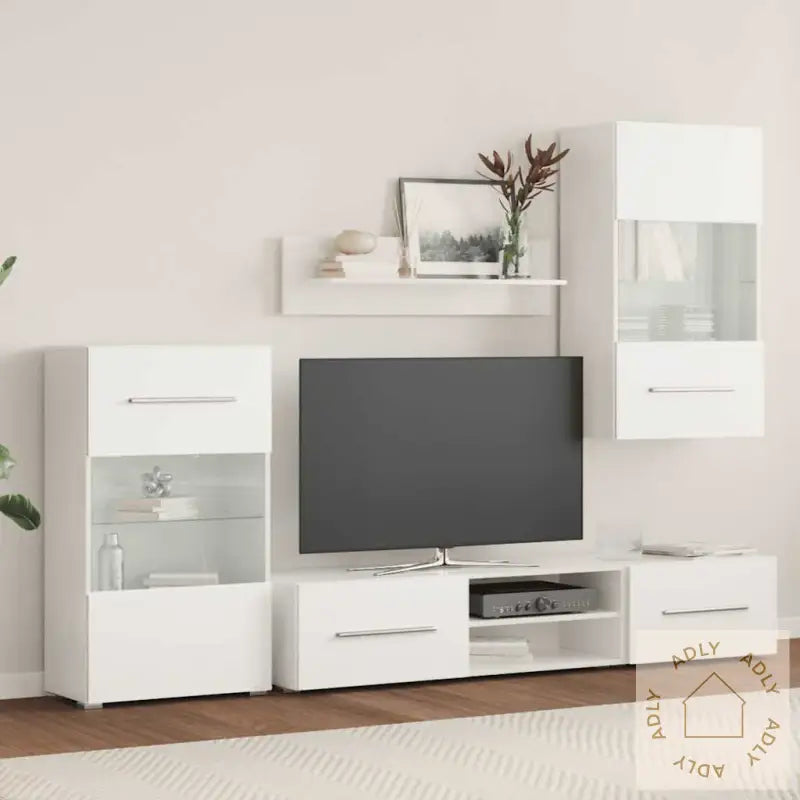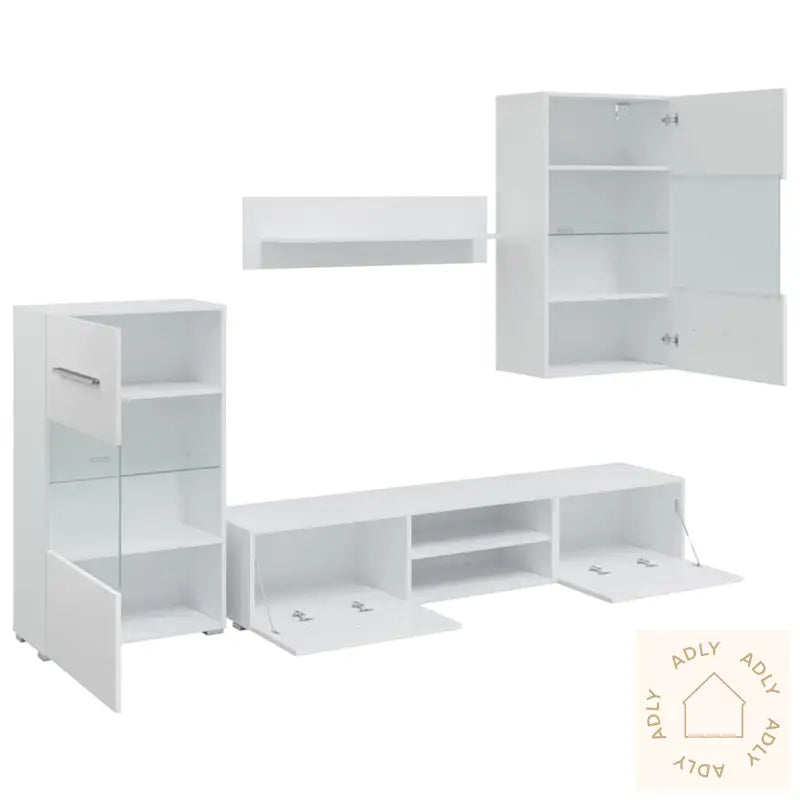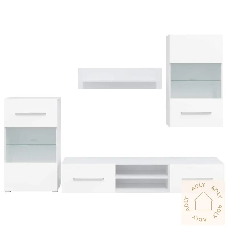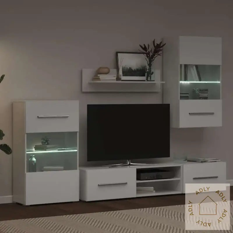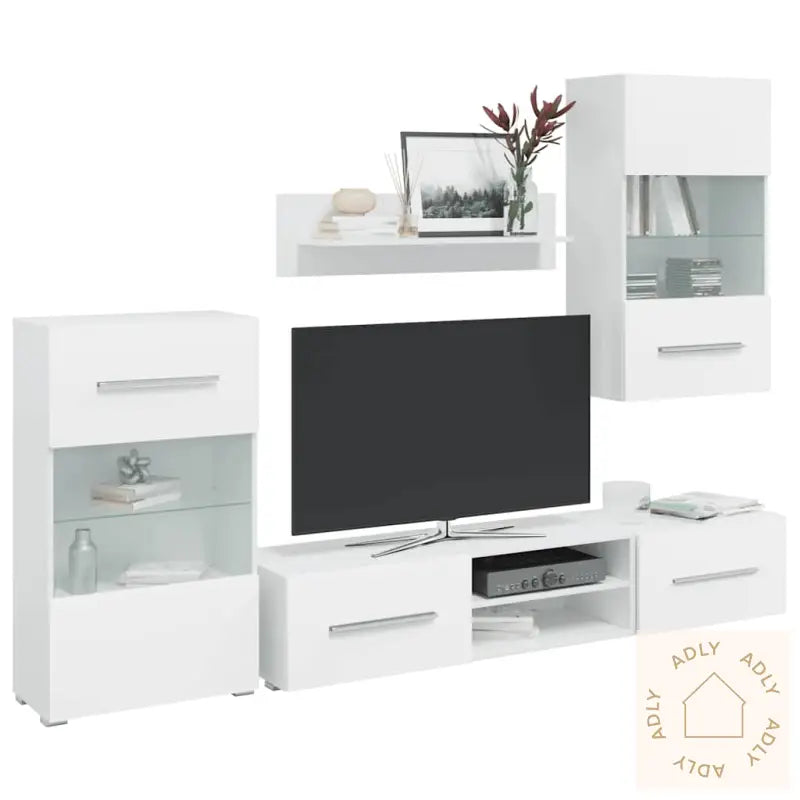 Stabilt og slitesterkt materiale: Konstruert tre er kjent for sin bemerkelsesverdige holdbarhet og stabilitet. Den jevne overflaten er både motstandsdyktig mot fukt og vridning, noe som gjør materialet til et trygt valg for møbler du trenger å stole på i mange år fremover. Den robuste konstruksjonen sørger for at både stående skap, lowboards og veggskap tåler hverdagens bruk uten problemer.Rikelig med lagringsplass: Settet består av alt du trenger for effektiv romorganisering – veggskap, gulvstående skap, to lowboards og vegghylle. Du får god plass til multimedieenheter, bøker, spill og andre småting, samtidig som åpne flater enkelt lar deg vise frem dekor eller planter for personlig preg.Moderne estetikk: Den matte hvite finishen og stramme linjer gir et rent og moderne utseende som passer inn uansett om du har skandinavisk enkelhet eller mer urban stil hjemme. Med raffinerte detaljer, glatte flater og diskré aksenter, vil disse enhetene gli sømløst inn med både populære og klassiske interiørtrender.Forbedret funksjonalitet: TV-skapenes nedtrekksdører lar deg holde orden på elektronikk og kabler, mens du skjuler rot. Veggskap og stående skap inkluderer delvis glaserte dører og en glasshylle med energieffektiv LED-belysning i hvitt, perfekt for å skape stemning og sette favorittgjenstandene dine i fokus – alt uten å ofre stil eller brukervennlighet.Plassbesparende design: Vitrineskapene hjelper deg å maksimere plassen i stuen din. Siden de ulike enhetene kan plasseres sammen eller hver for seg, får du en fleksibel løsning tilpasset både små og store rom. Dette møbelsettet leverer både praktisk lagring og stilig uttrykk, perfekt for moderne livsstil hvor plass ofte er en utfordring.Godt å vite: