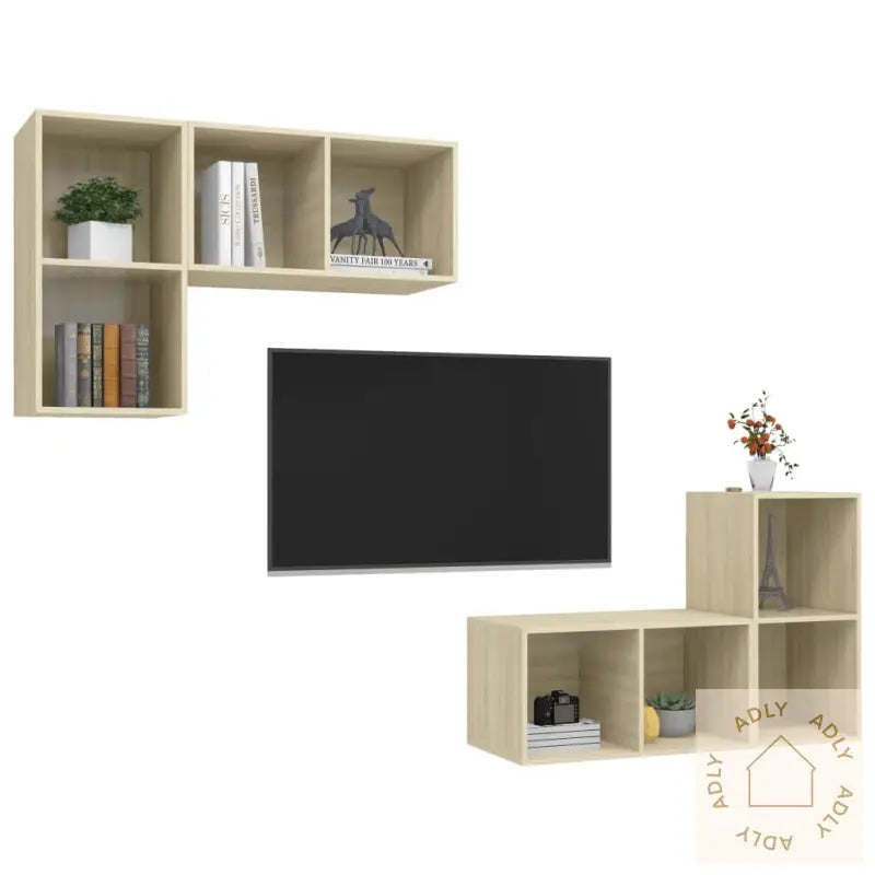 Dette stilige settet med veggmonterte TV-benker i sonoma eik gir hjemmet ditt et moderne preg og rikelig med praktisk oppbevaringsplass for diverse gjenstander. Perfekt for deg som ønsker møbler til hjemmet som både ser bra ut og gjør hverdagen mer organisert. Med sine smarte oppbevaringsmuligheter bidrar disse TV-benker til å holde alt ryddig, samtidig som de blir et iøynefallende blikkfang i rommet.