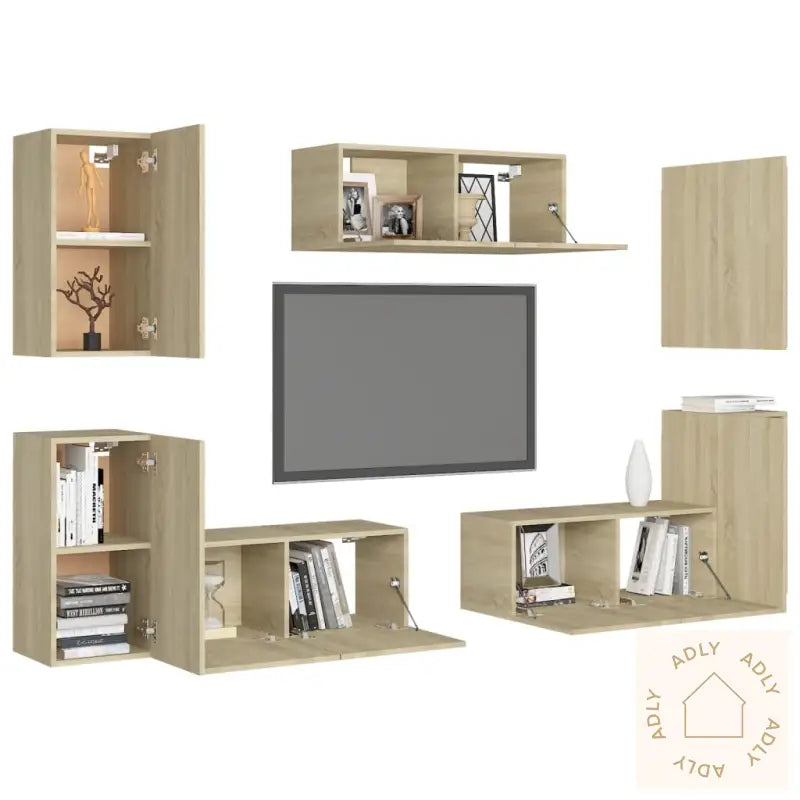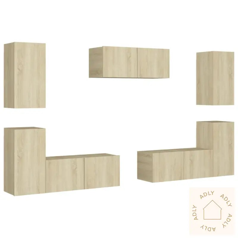 Farge: sonoma eikMateriale: konstruert treMål (L): 80 x 30 x 30 cm (B x D x H)Mål (M): 30,5 x 30 x 60 cm (B x D x H)Montering kreves: jaLeveransen inneholder:3 x TV-benk (L)4 x TV-benk (M)