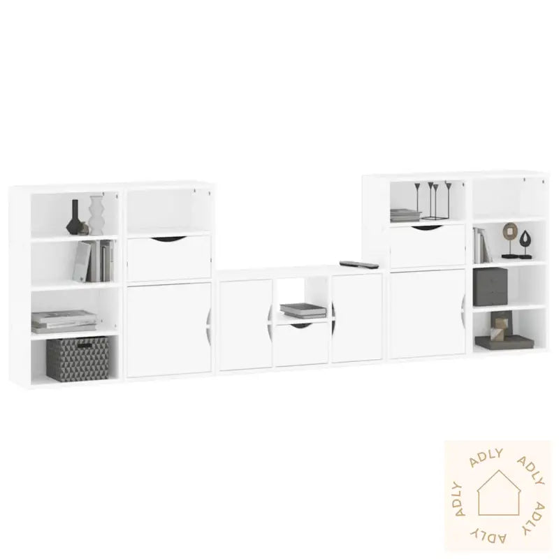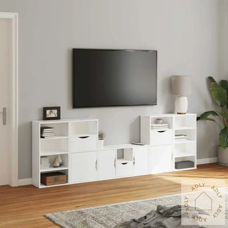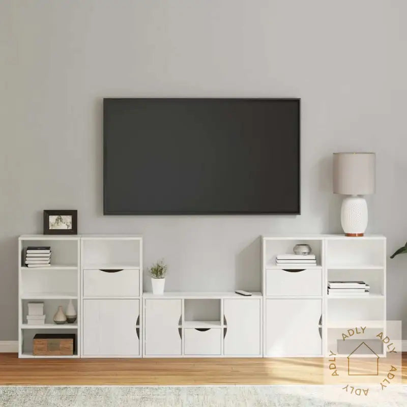 Farge: hvitMaterialer: heltre furu, konstruert treTV-skap mål: 79 x 24 x 40 cm (B x D x H)Sideskapsmål: 40 x 24 x 79 cm (B x D x H)Utvalg: ODDAMontering kreves: jaLeveransen inneholder:1 x TV-benk2 x sideskap (med 1 skuff og 1 dør)2 x sideskap (med 4 åpne hyller)