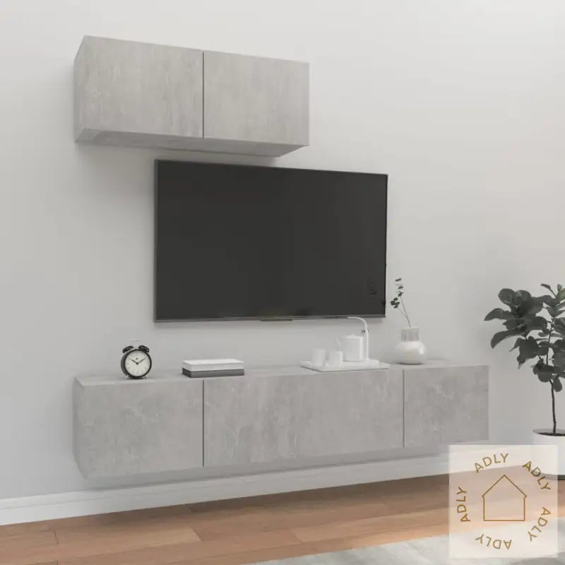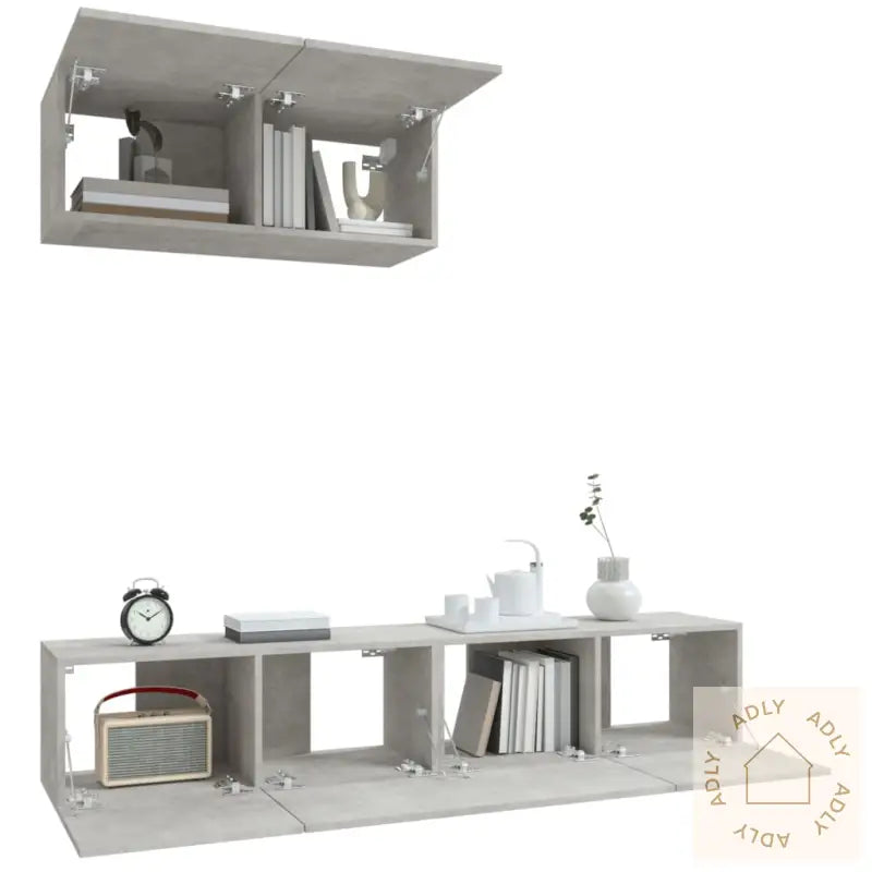 Skrue(r) og plugg(er) til innfesting i vegg følger ikke med. Pass på å bruke festeutstyr som egner seg for nettopp dine vegger. Er du i tvil, anbefales det å rådføre seg med fagfolk. Husk å følge instruksjonene i monteringsmanualen nøye for best mulig resultat.Hvert produkt inkluderer en tydelig monteringsveiledning, så du slipper å lure på hvordan det skal settes sammen. Montering av møbler blir enkelt og effektivt.Farge: betonggrå – en moderne, nøytral farge som passer godt til de fleste interiørstiler.Materiale: konstruert tre – slitesterkt og motstandsdyktig materiale for langvarig bruk.Mål (hver): 80 x 30 x 30 cm (L x B x H) – gjør det lett å plassere flere enheter sammen eller hver for seg, alt etter hva som passer ditt hjem.Leveransen inneholder:3 x TV-benker for ekstra lagringsplass og fleksibilitet.