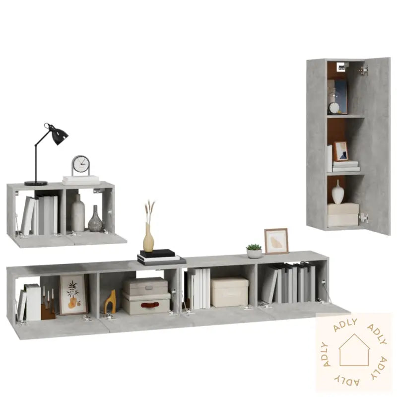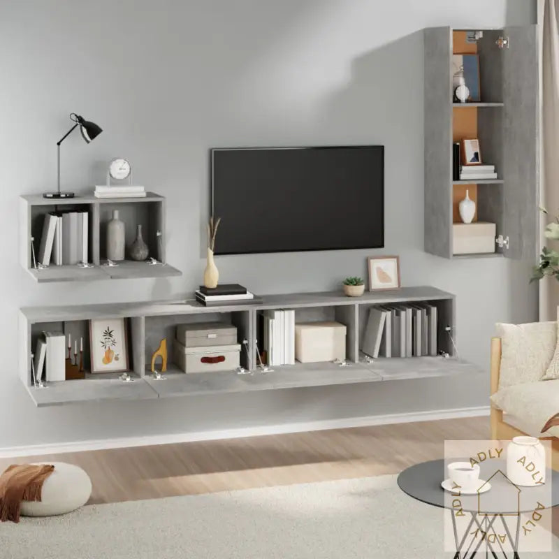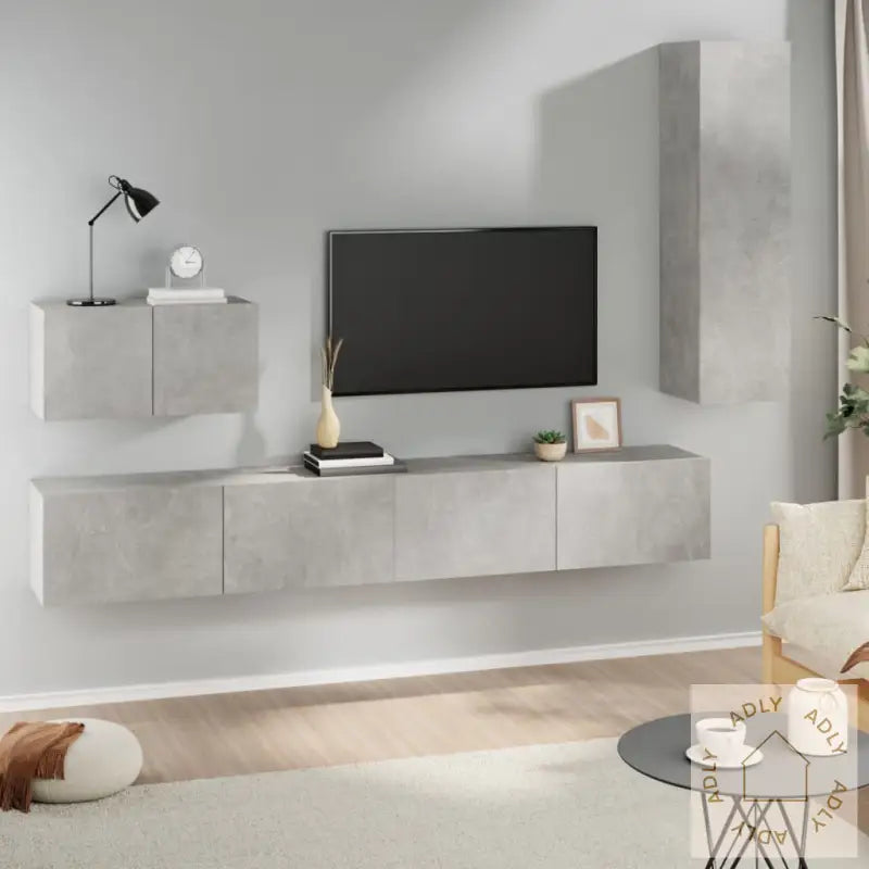 Skrue(r) og plugg(er) til veggmontering følger ikke med – sørg for å finne riktige fester til dine vegger. Er du usikker, anbefaler vi å rådføre deg med fagfolk. Husk også å lese og følge instruksjonene nøye når du monterer.Monteringsveiledning følger selvfølgelig med, så du enkelt kan sette sammen de ulike delene.Farge: betonggrå – passer sømløst inn blant moderne møbler.Materiale: konstruert tre, for varig bruk.Settet inneholder:2 x TV-skap: 100 x 30 x 30 cm (B x D x H)1 x TV-benk: 60 x 30 x 30 cm (B x D x H)1 x TV-benk: 30,5 x 30 x 110 cm (B x D x H)Samle alle elektroniske enheter, dekorer med bøker eller bruk skapene sammen med andre møbler og hagemøbler for et helhetlig og stilig hjem. Dette settet er en smart investering for deg som vil ha en funksjonell løsning til oppbevaring og TV som varer lenge, passer til både små og store rom, og kompletterer resten av dine møbler til hjemmet.