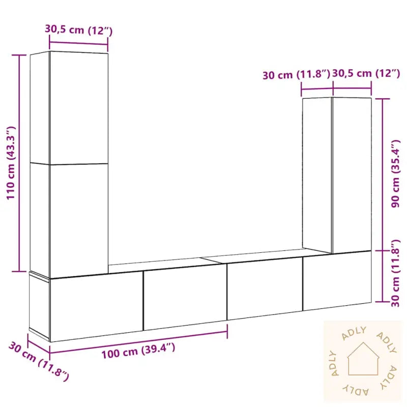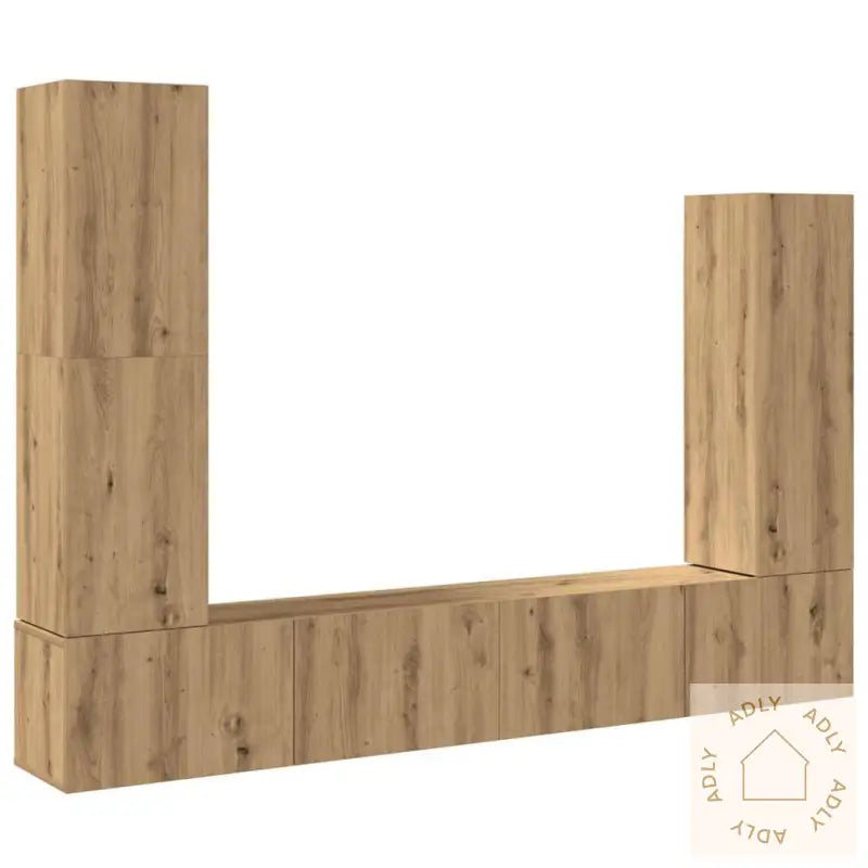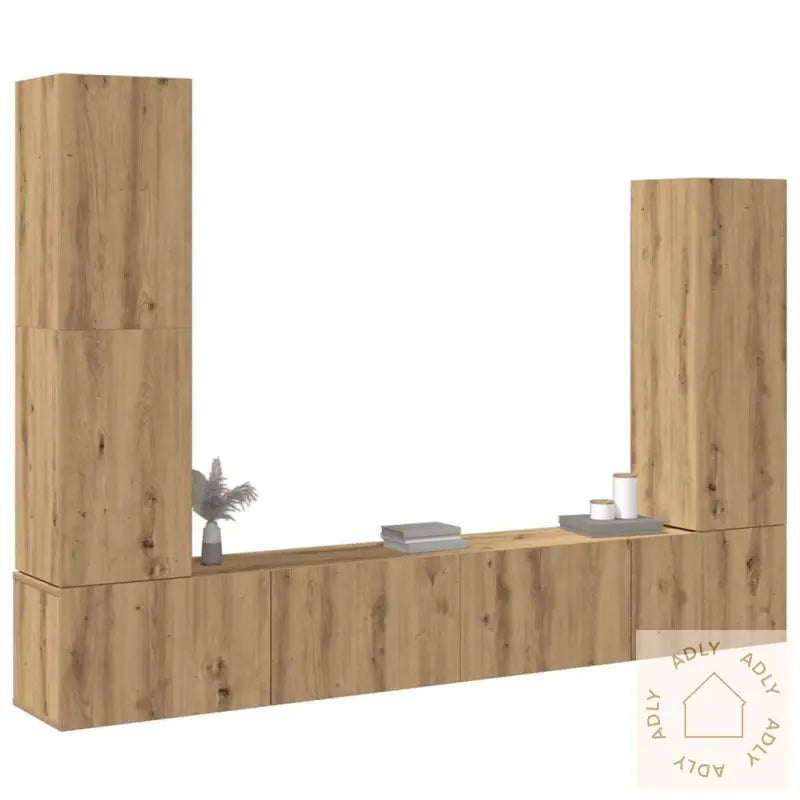Skruer og plugger til veggmontering følger ikke med. Velg skruer og plugger som er egnet for nettopp dine vegger. Hvis du er usikker, anbefaler vi å rådføre deg med fagfolk. Følg monteringsanvisningen nøye for beste resultat.Farge: artisan eik – gir et varmt og naturlig uttrykk til hjemmet.Materiale: konstruert tre – gir slitestyrke og holdbarhet.Montering kreves: jaLeveransen inneholder:1 x TV-benk: 30,5 x 30 x 110 cm (B x D x H)1 x TV-benk: 30,5 x 30 x 90 cm (B x D x H)2 x TV-skap: 100 x 30 x 30 cm (B x D x H)
