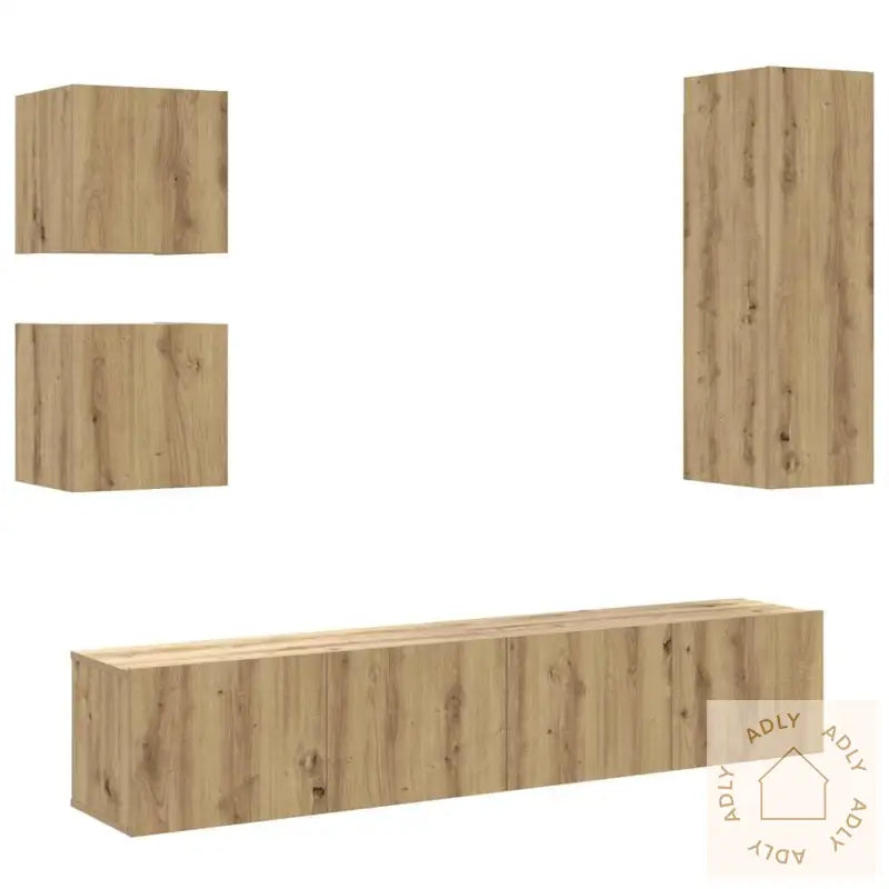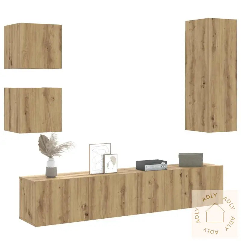 Skruer og plugger til veggmontering følger ikke med. Vi anbefaler å velge festemidler som passer til akkurat dine vegger. Ta gjerne kontakt med fagfolk om du er usikker, og følg alltid instruksjonene nøye.Farge: artisan eik – gir en tidløs og varm følelse som passer til de fleste interiørstiler og andre møbler til hjemmet.Materiale: konstruert treMontering kreves: jaLeveransen inneholder:2 x TV-benk: 30,5 x 30 x 30 cm (B x D x H)1 x TV-benk: 30,5 x 30 x 90 cm (B x D x H)2 x TV-skap: 80 x 30 x 30 cm (B x D x H)