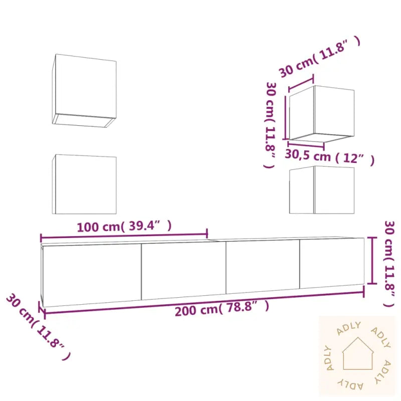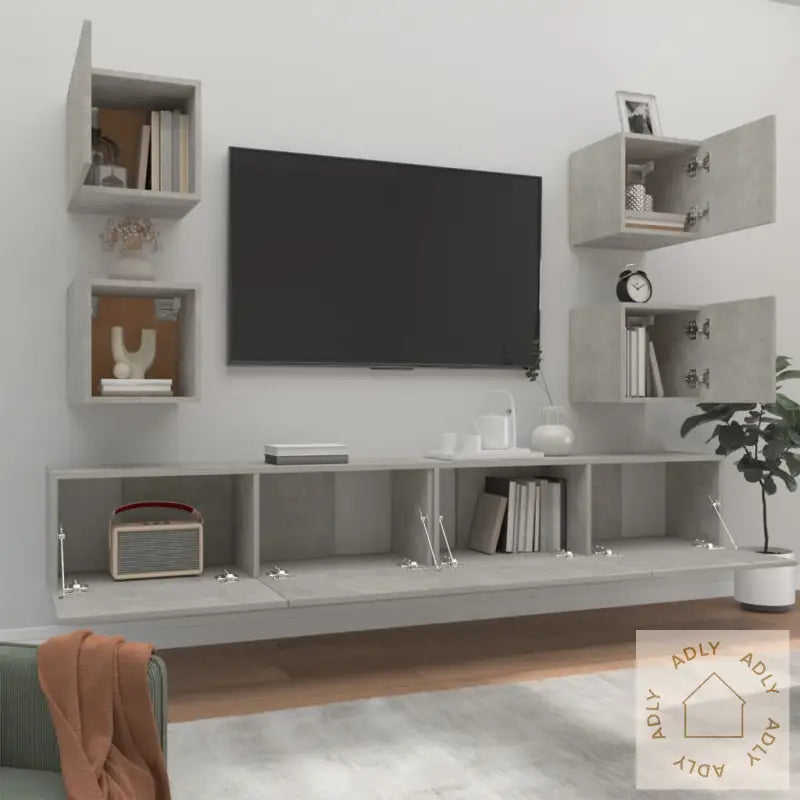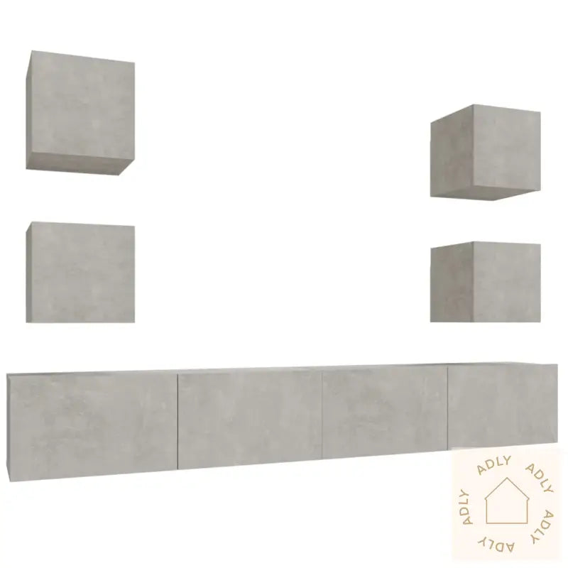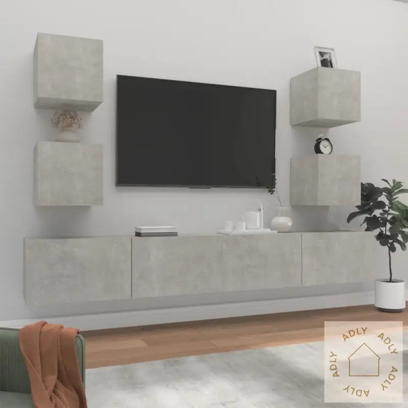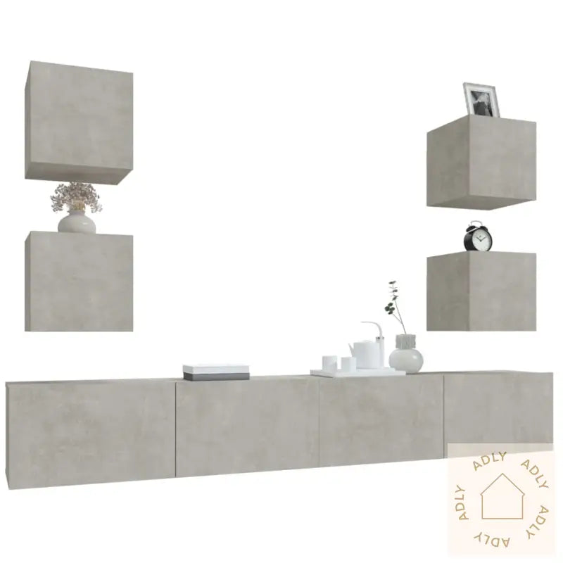 Skrue(r) og plugg(er) for innfesting i vegg følger ikke med. Velg skruer og plugger som er tilpasset din veggtype. Hvis du er usikker på valg av festemateriell, anbefales det å søke profesjonell hjelp. Les alltid monteringsanvisningen nøye før oppstart.Det følger med en tydelig monteringsveiledning i pakken, slik at du enkelt kan sette sammen ditt nye møbel selv.Farge: betonggrå – gir en rå og moderne touch som passer sammen med en rekke ulike stiler og andre møbler.Materiale: konstruert tre med lang holdbarhet.Leveransen inneholder:2 x TV-skap: 100 x 30 x 30 cm (B x D x H)4 x TV-benker: 30,5 x 30 x 30 cm (B x D x H)Dette komplette TV-benksettet er en attraktiv løsning for alle som vil ha flotte møbler til hjemmet og praktisk oppbevaring uten at det går på bekostning av stilen. Settet fungerer også fint sammen med bokhyller og stående hyller for deg som trenger ekstra lagringsmuligheter og liker å kombinere flere typer møbler.