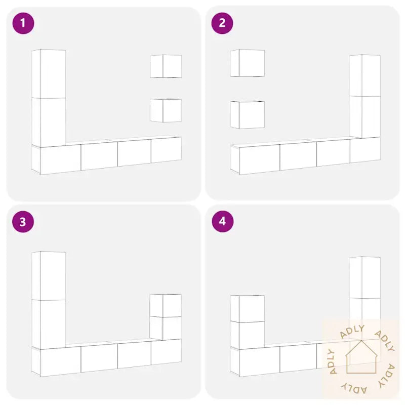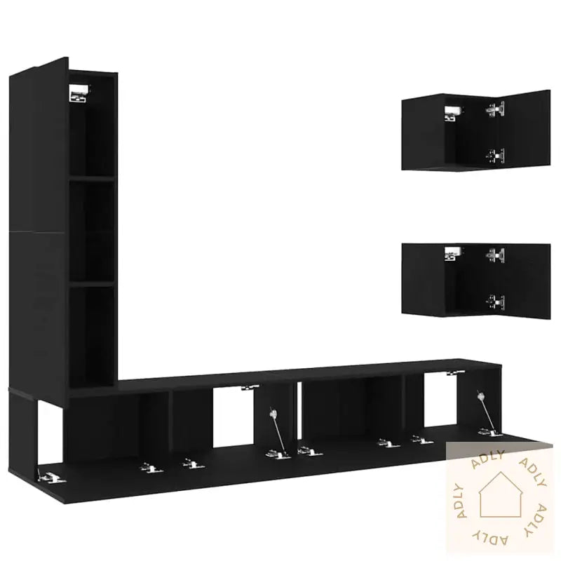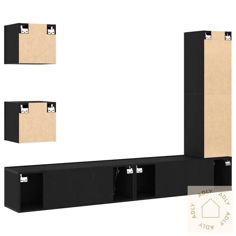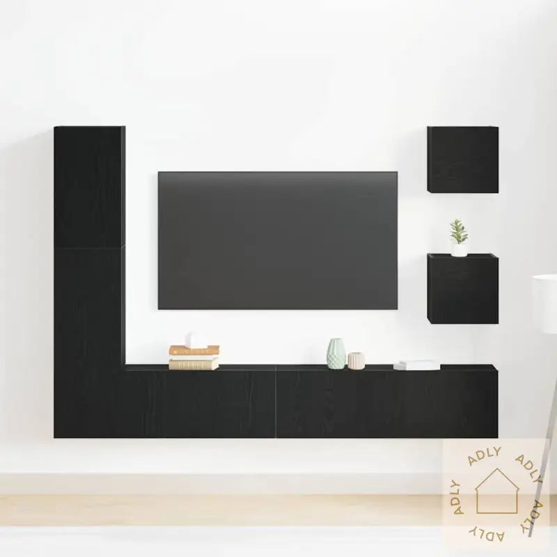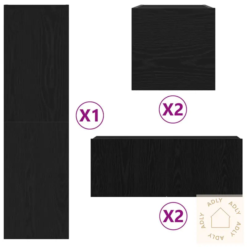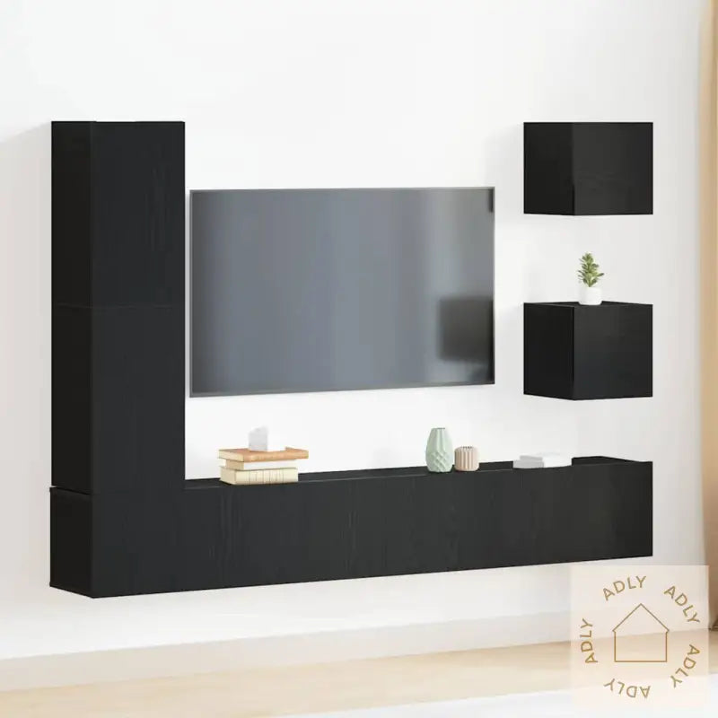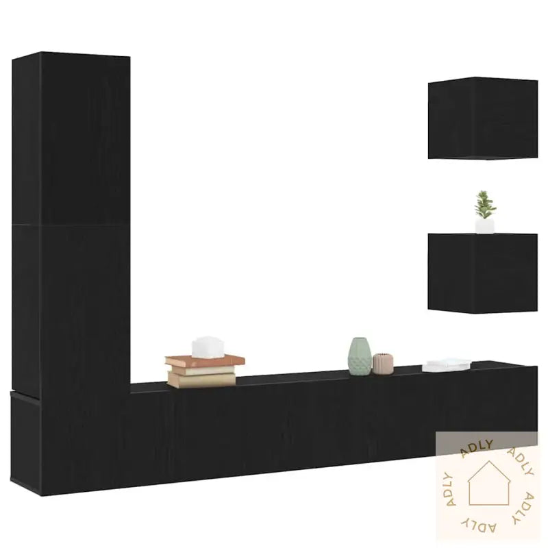 Dette TV-skapsettet kombinerer stil og funksjon, og gir deg rikelig med lagringsplass til alt av medieutstyr. Med sin moderne svarte eik-finish får stuen eller hjemmekinoen et elegant og oppdatert uttrykk, perfekt hvis du ser etter møbler som både er stilige og praktiske. Møblene gjør det lett å skape et imponerende underholdningssenter hjemme.