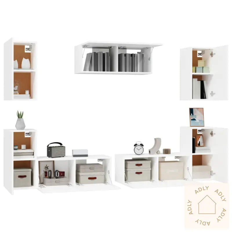 Skrue(r) og plugg(er) til å feste enheten til veggen følger ikke med. Det er viktig å finne riktige skruer og plugger til akkurat dine vegger – spør gjerne fagfolk hvis du er usikker. Følg instruksjonene nøye under montering.Alle deler leveres med en monteringsveiledning som gjør det enkelt å sette sammen møblene selv.Farge: hvitMateriale: konstruert treLeveransen inneholder:3 x TV-skap: 80 x 30 x 30 cm (B x D x H)4 x TV-benker: 30,5 x 30 x 60 cm (B x D x H)