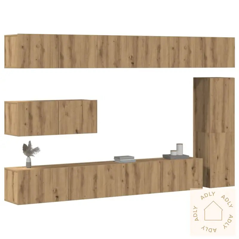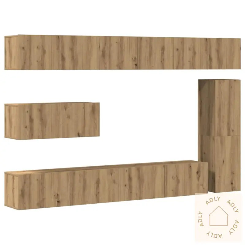 Skruer og plugger for veggmontering er ikke inkludert. Det anbefales å velge skruer og plugger tilpasset akkurat dine vegger, og kontakte fagperson ved usikkerhet. Husk å følge alle monteringsinstruksjoner nøye for et sikkert resultat.Farge: artisan eikMateriale: konstruert treMontering kreves: jaLeveransen inneholder:1 x TV-benk: 30,5 x 30 x 110 cm (B x D x H)4 x TV-skap: 80 x 30 x 30 cm (B x D x H)2 x TV-skap: 100 x 30 x 30 cm (B x D x H)