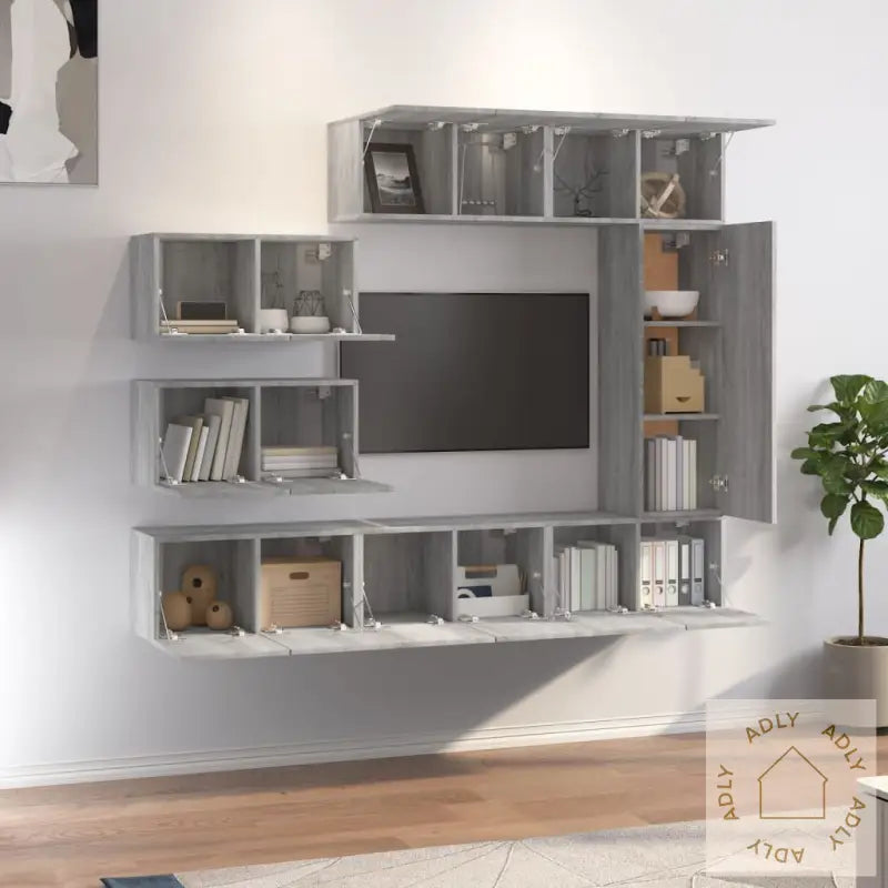 Skrue(r) og plugg(er) for innfesting i veggen er ikke inkludert. Velg alltid egnet monteringsutstyr som passer din veggtype. Ved usikkerhet anbefales det å søke profesjonell veiledning. Følg alltid instruksjonene nøye for sikker montering.Hvert produkt leveres med en brukervennlig monteringsveiledning som gjør det lett å sette sammen møblene dine.Farge: Grå sonoma – en tidløs og moderne farge som lett lar seg matche med ulike typer hagemøbler eller annen innredning hjemme.Materiale: Konstruert treTV-skap (med 2 dører): 60 x 30 x 30 cm (B x D x H)TV-skap (med 1 dør): 30,5 x 30 x 90 cm (B x D x H)Leveransen inneholder:7 x TV-skap (med 2 dører)1 x TV-skap (med 1 dør)