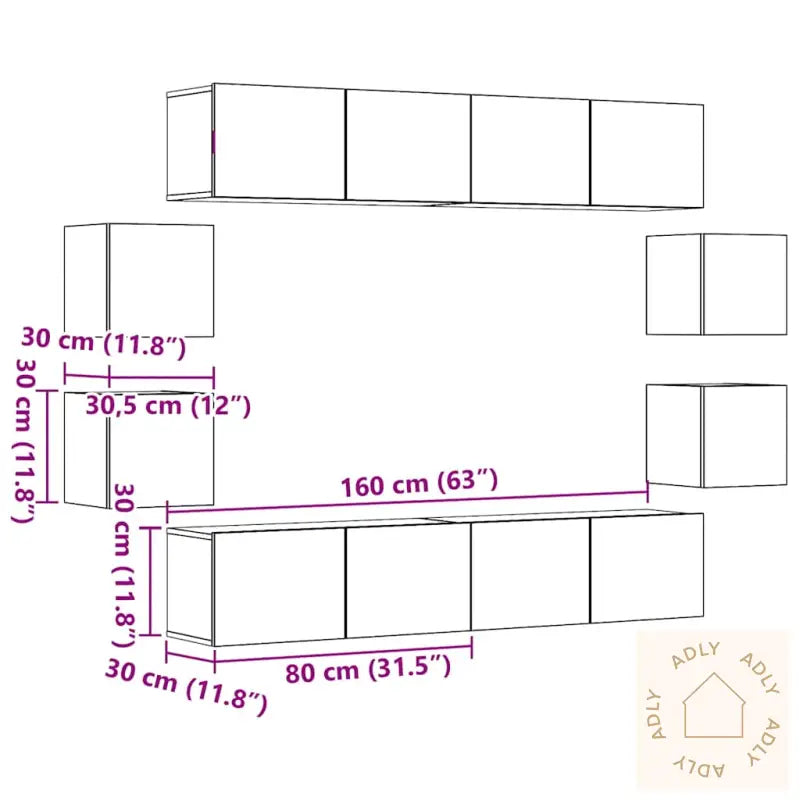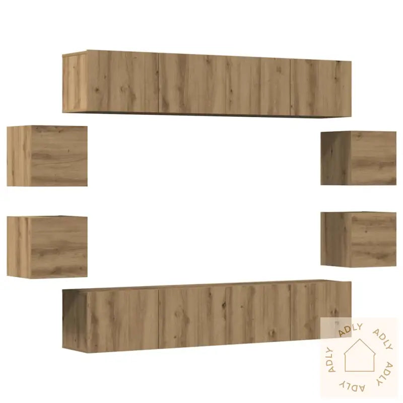 Skruer og plugger for veggmontering følger ikke med. Husk å finne riktig type som passer for dine vegger – spør gjerne en fagperson hvis du er usikker, og følg instruksjonene nøye for sikker montering.Farge: artisan eikMateriale: konstruert treMål veggmontert TV-skap (L): 80 x 30 x 30 cm (B x D x H)Mål veggmontert TV-skap (S): 30,5 x 30 x 30 cm (B x D x H)Maks vektkapasitet totalt: 60 kgMontering kreves: jaLeveransen inneholder:8 x vegghengte TV-benker