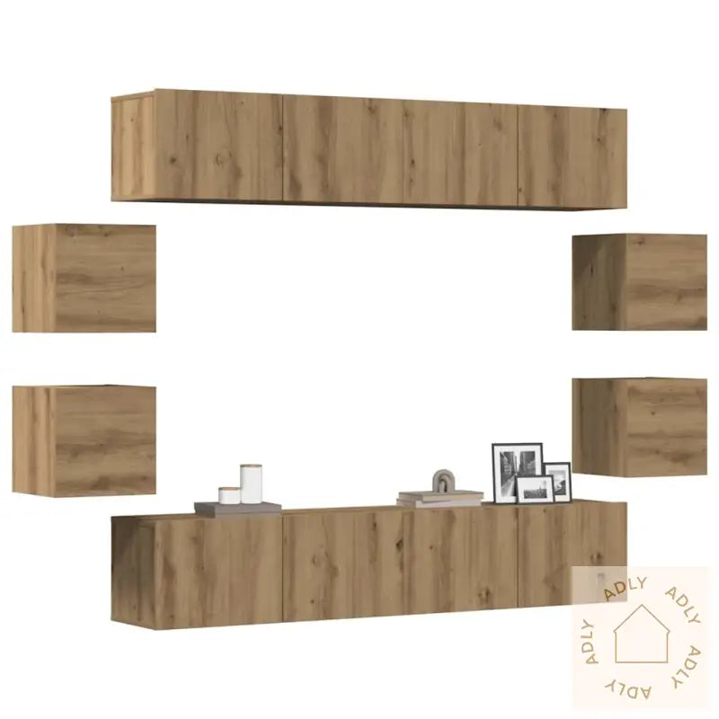 Stabilt og slitesterkt materiale: Produsert i konstruert tre, noe som gir en sterk og stabil konstruksjon. Overflaten er jevn og enkel å rengjøre, og materialet tåler både fuktighet og daglig bruk uten å vri seg eller sprekke. Det gjør dette TV-skapet til et solid valg for varig bruk i stua.Rikelig lagringsplass: Enten du vil ha plass til mediaenheter, spillkonsoller, fjernkontroller eller andre småting, gir dette veggmonterte TV-skapet deg god oppbevaringsplass. Du holder alt organisert og innen rekkevidde – uten at det ser rotete ut.Praktisk montering: Døren på skapet kan monteres enten på venstre eller høyre side, slik at du får den løsningen som passer best for møbleringen din. Dette gir deg fleksibilitet uansett hvor i rommet du velger å plassere skapet.Moderne stil: Med sitt rene uttrykk, rette linjer og den varme finishen i artisan eik, tilfører medieskapet et moderne preg til hjemmet. Skapet fremhever naturlig lys og gir rommet et lyst og åpent inntrykk.Godt å vite: