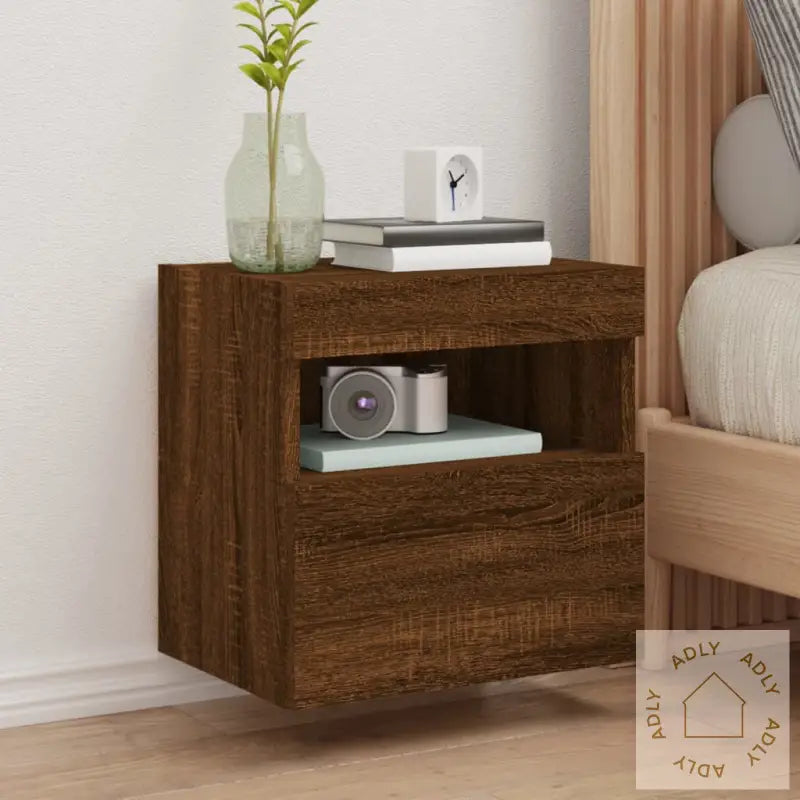 Skruer og plugger til montering medfølger ikke, så vi anbefaler at du bruker skruer og plugger som passer akkurat til din veggtype. Er du usikker, kan det være lurt å spørre en fagperson og følge monteringsinstruksene nøye.Skapet har en USB-kontakt til RGB LED-lysene og krever derfor en sertifisert 5V USB-strømkilde (ikke inkludert).Farge: Brun eik – gir et varmt og naturlig preg som passer til ulike stiler av møbler til hjemmet eller som del av din hagemøbler-inspirerte innredning.Materiale: Konstruert treMål: 40 x 30 x 40 cm (B x D x H)Montering kreves: Ja
