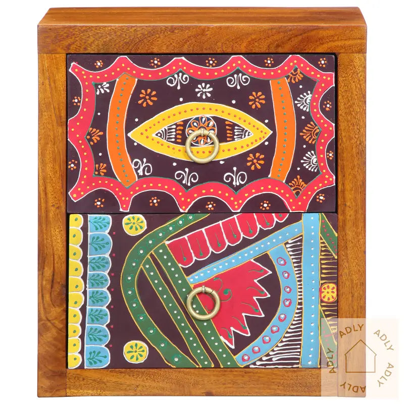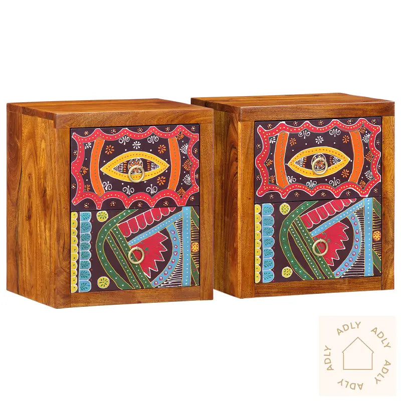 God oppbevaringsplass med to store skuffer i hvert nattbord, så du enkelt kan organisere alt fra bøker og briller til andre hverdagsting.Fargerikt og dekorativt uttrykk: De geometriske designene gir nattebordene personlighet og gjør de til et blikkfang blant andre møbler og bokhyller.Holdbar konstruksjon: Skapene er laget i solid akasietre (Sheesham), så du får robuste møbler som varer lenge.Glatt og gjennomført finish – den polerte overflaten ser flott ut og er lett å rengjøre og holde pen.Allsidig bruk: Passer ikke bare på soverommet, men også sammen med andre møbler og stående hyller i ulike rom der ekstra oppbevaring trengs.Mønster: Geometrisk (kombinasjon av former som trekanter, firkanter og sirkler gir et moderne, dynamisk utrykk)Form: RektangulærMateriale: Massivt akasietreOverflatebehandling: Polert for ekstra holdbarhet og stilrent utseendeInnendørs/ute: Kun til innendørs brukCover inkludert: NeiRom: SoveromBatterier inkludert: NeiMål: 35 x 30 x 40 cm (L x B x H), slik at de passer godt ved siden av sengen uten å ta for mye plassMerke: Levering inkluderer: 2 nattebordMontering kreves: JaAnbefalt antall personer for montering: 2 – montering går lettest sammen!