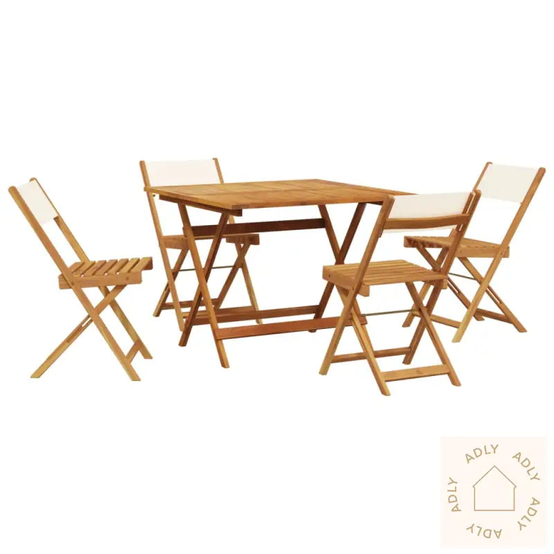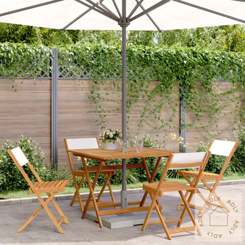 For ekstra lang levetid og at hagemøblene holder seg pene år etter år, anbefaler vi å bruke et vanntett møbeltrekk når de ikke er i bruk. Dette beskytter heltre akasie mot regn og fuktighet.Bord:Materiale: oljebehandlet heltre akasieMål: 90 x 90 x 75 cm (L x B x H)Diameter parasollhull: 5 cmSammenleggbarHagestol:Farge: kremhvitMaterialer: heltre akasie med oljefinish, stoff (100% polyester)Samlet mål: 41 x 52,5 x 102,5 cm (B x D x H)Mål sete: 38 x 35 cm (B x D)Høyde sete fra bakken: 44 cmMaksimal lastekapasitet (per sete): 110 kgPute inkludert: neiMontering kreves: jaLeveransen inneholder:1 x hagebord4 x hagestoler