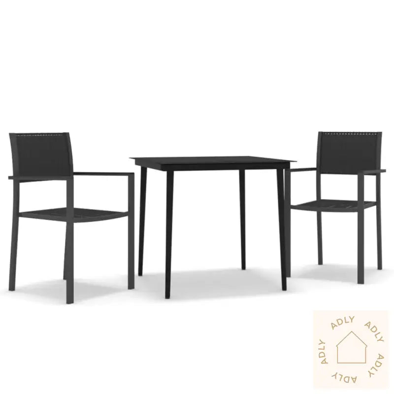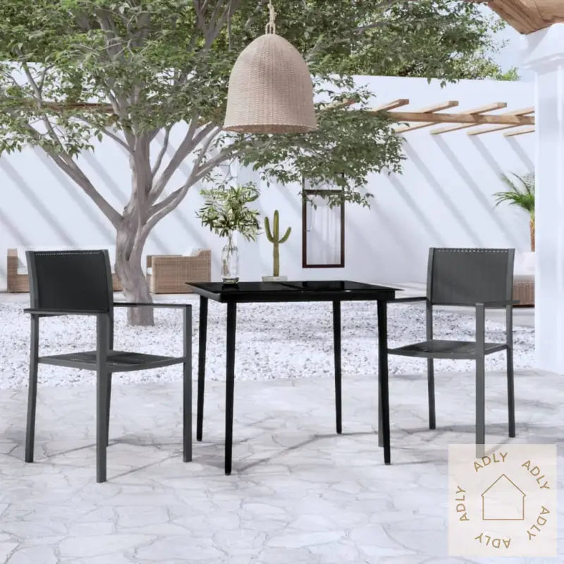 Bord:Farge: svartMaterialer: pulverlakkert stål, glassMål: 80 x 80 x 74 cm (L x B x H)Stol:Farge: svartMaterialer: pulverlakkert stål, plastMål: 58,5 x 53,5 x 88,5 cm (B x D x H)Slitesterk plast med håndvevd rottingdesignMaksimal lastekapasitet: 110 kgMontering kreves: jaLeveransen inneholder:1 x bord2 x stoler
