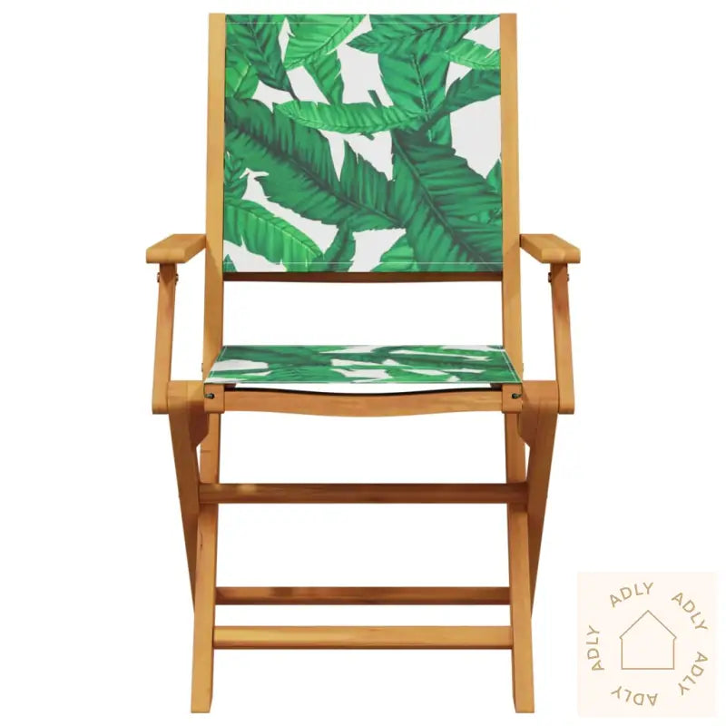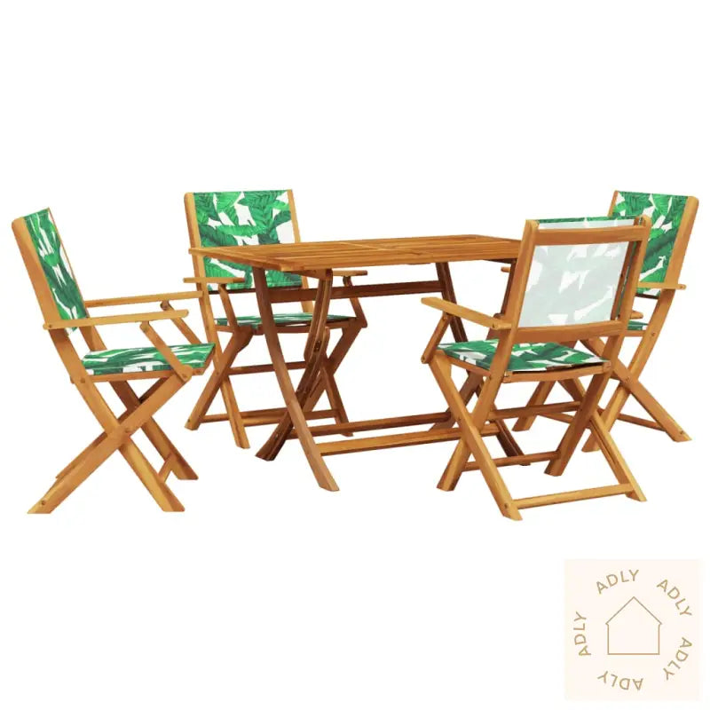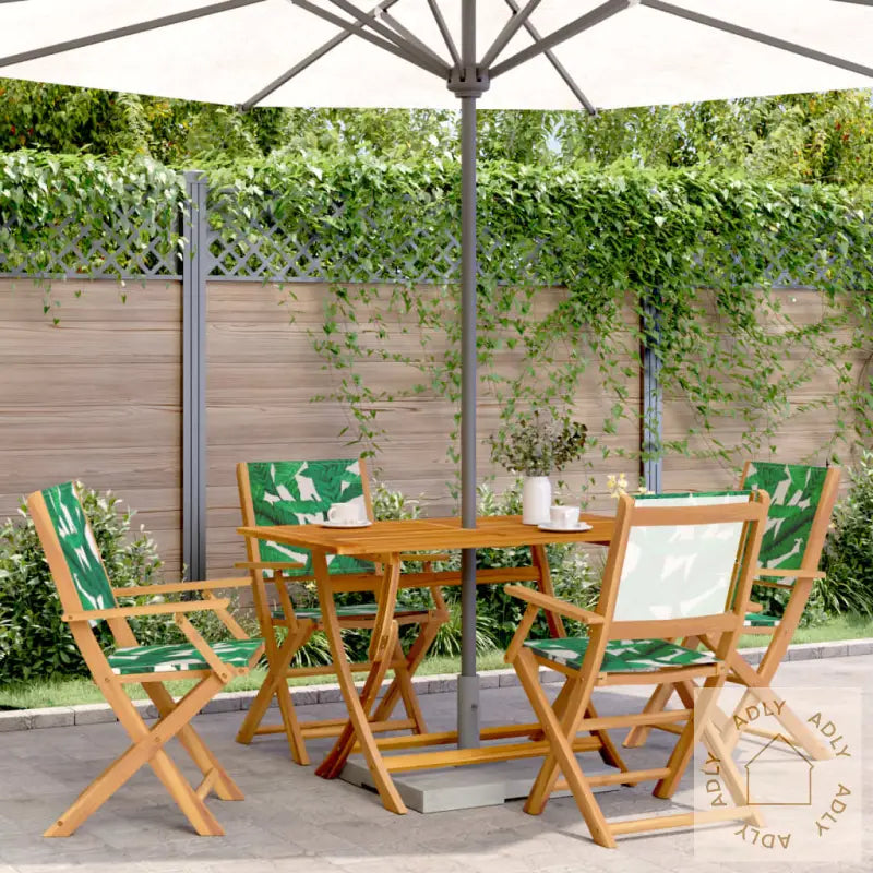 For å bevare utseendet på dine utendørsmøbler over tid, anbefaler vi å bruke et vanntett trekk når møblene ikke er i bruk. Det gir ekstra beskyttelse mot regn og fuktighet, og forsterker holdbarheten til heltre akasie.Bord:Materiale: Oljebehandlet heltre akasieMål: 120 x 70 x 75 cm (L x B x H)Sammenleggbart for enkel lagringHagestol:Farge: GrønnMaterialer: Heltre akasie med oljefinish, slitesterkt stoff (100% polyester)Størrelse: 54 x 58 x 91 cm (B x D x H)Setemål: 40 x 38 cm (B x D)Setehøyde fra bakken: 44 cmArmlenehøyde fra bakken: 63 cmMaksimal vekt per sete: 110 kgStolen har dekorativt bladtrykkPute medfølger ikkeMontering krevesPakken inneholder:1 x hagebord4 x hagestoler