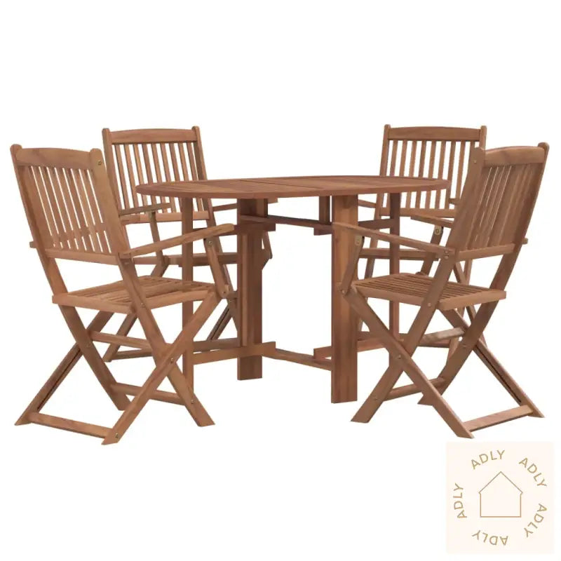 Denne spisestuen i heltre akasie gir uteplassen din et varmt, rustikt uttrykk og blir lett det naturlige samlingspunktet for familie og venner. Akasietreet er kjent for sin styrke og holdbarhet, noe som gjør disse hagemøblene ideelle for nordisk klima – de tåler både regn og sol, og holder seg flotte år etter år. Den oljebehandlede overflaten fremhever treets vakre struktur, samtidig som sanda finishen gjør dem behagelige å ta på og enkle å tørke av ved søl eller pollen. Når du trenger ekstra plass, kan både bordet og stolene foldes sammen og settes bort – perfekt for små uteområder eller for å forlenge levetiden på møblene gjennom vinteren. Disse møblene til hjemmet er enkle å montere, slik at du raskt kan nyte uterommet ditt med stil. Leveransen inkluderer alt du trenger for å komme i gang med utendørs måltider: 1 bord og 4 stoler.