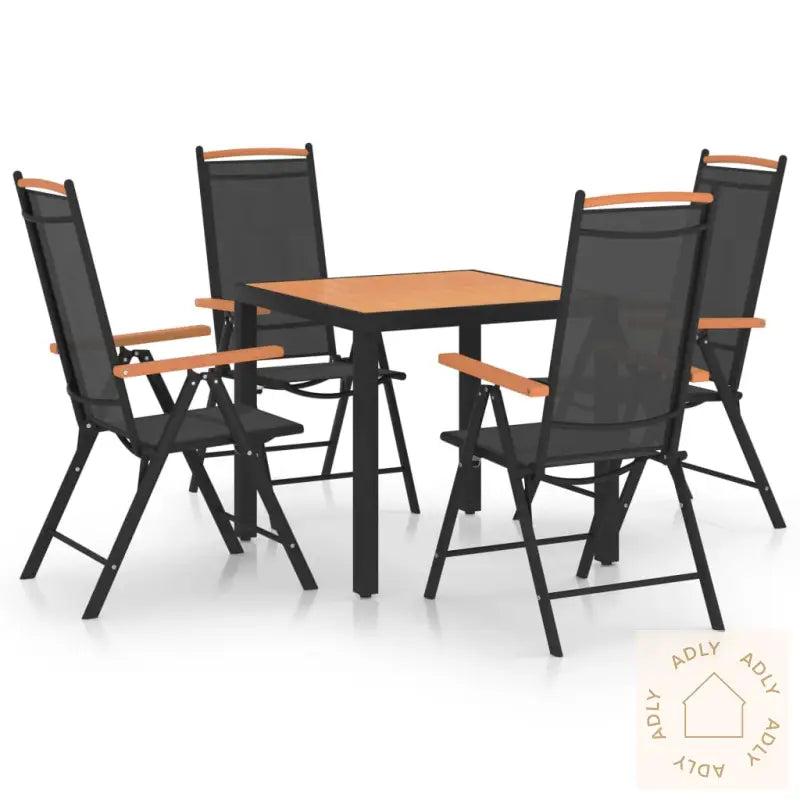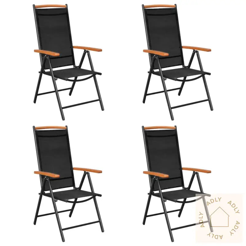 Farge: svartMaterialer: pulverlakkert aluminium, textilene, WPCMål stol: 58 x 65 x 109 cm (B x D x H)Bredde sete: 44 cmDybde sete: 44 cmHøyde sete fra bakken: 43,5 cmHøyde armlene fra bakken: 65 cmRyggstøtten kan tilbakelenes i 7 stillingerMål bord: 80 x 80 x 74 cm (L x B x H)Montering kreves: jaLeveransen inneholder:1 x bord4 x stoler