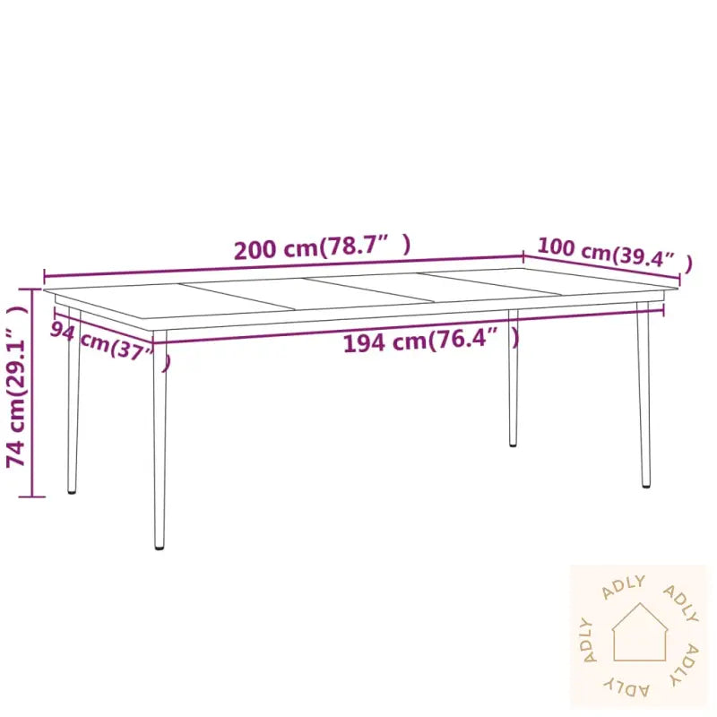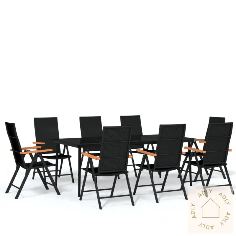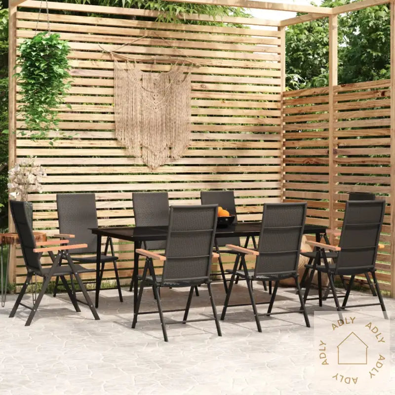 Bord:Farge: svartMaterialer: pulverlakkert stål, herdet glassMål: 200 x 100 x 74 cm (L x B x H)Stol:Farge: svartMaterialer: PE-rotting, aluminium med pulverbelagt overflate, WPCMål: 55 x 64 x 105 cm (B x D x H)Stolens ryggstøtte kan reguleres i 7 stillingerVærbestandigMontering kreves: jaLeveransen inneholder:1 x bord8 x stoler