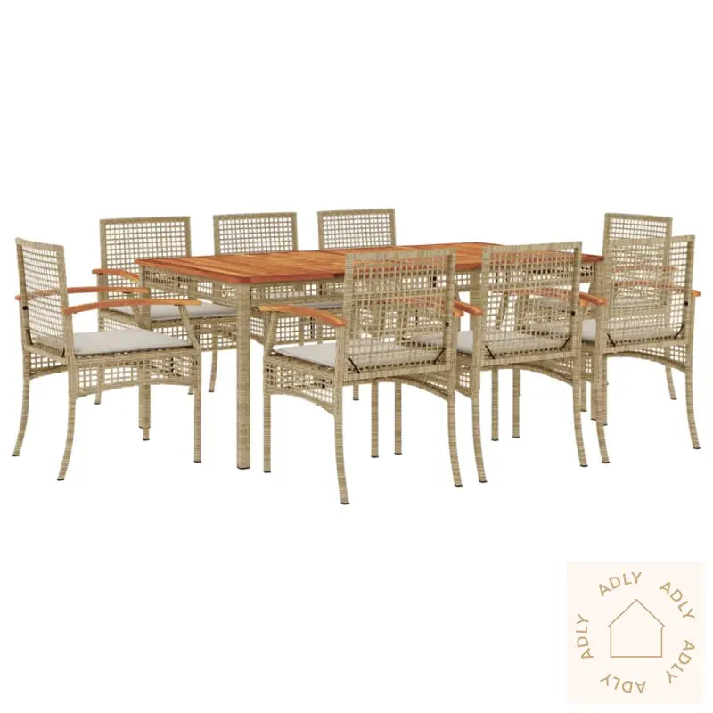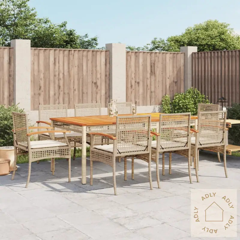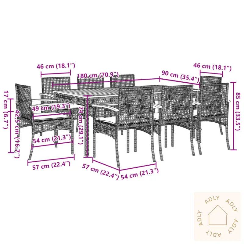 For å sikre at utemøblene dine beholder sitt fine utseende lengst mulig, anbefales det å bruke et vanntett trekk ved regn eller utenfor sesong.Maksimal lastekapasitet per sete: 110 kgMontering kreves: jaBord:Farge: beigeMaterialer: PE-rotting, pulverlakkert stål, heltre akasie med oljefinishMål: 180 x 90 x 75 cm (L x B x H)Diameter midtre hull: 5 cmStol:Farge: beigeMaterialer: PE-rotting, pulverlakkert stål, heltre akasie med oljefinishMål: 54 x 57 x 85 cm (B x D x H)Mål sete: 46,5 x 49 cm (B x D)Høyde sete fra bakken: 42,5 cmHøyde armlene fra bakken: 59,5 cmPute:Farge: kremhvitMateriale trekk: stoff (100% polyester)Materiale fyll: skumMål stolpute: 46 x 48 x 3 cm (B x D x T)Leveransen inneholder:1 x hagebord8 x hagestoler8 x seteputer med avtagbart og vaskbart trekk