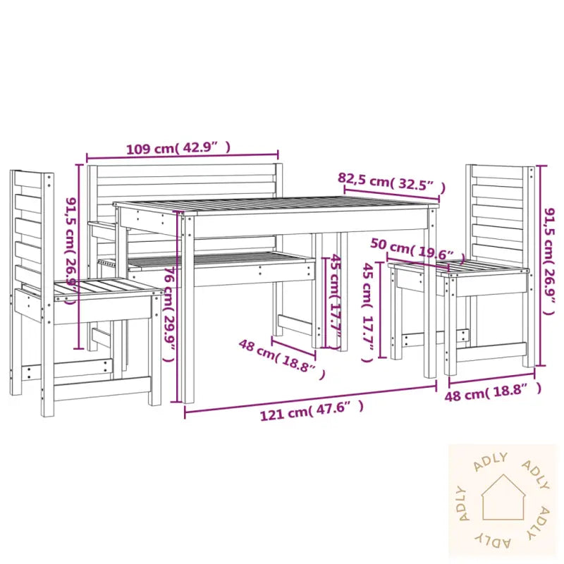 For å bevare det vakre utseendet til utendørs spisestuen, anbefaler vi å beskytte heltre douglasgran-møblene med et vanntett trekk når de ikke er i bruk.Materiale: heltre douglasgran (ubehandlet)Bord:Mål: 121 x 82,5 x 76 cm (L x B x H)Hagestol:Mål: 50 x 48 x 91,5 cm (B x D x H)Bredde sete: 50 cmHøyde sete fra bakken: 43 cmMaksimal lastekapasitet (per sete): 110 kgHagebenk:Mål: 109 x 48 x 91,5 cm (B x D x H)Dybde sete: 44 cmHøyde sete fra bakken: 45 cmMaksimal lastekapasitet (per sete): 110 kgMontering kreves: jaLeveransen inneholder:2 x hagestoler1 x hagebenk1 x bord