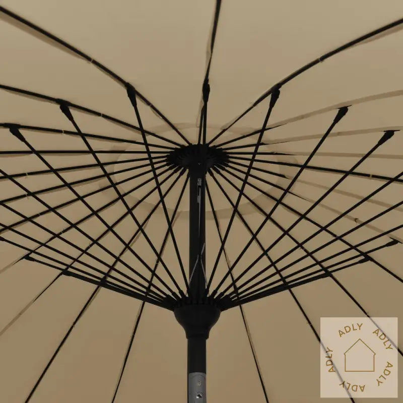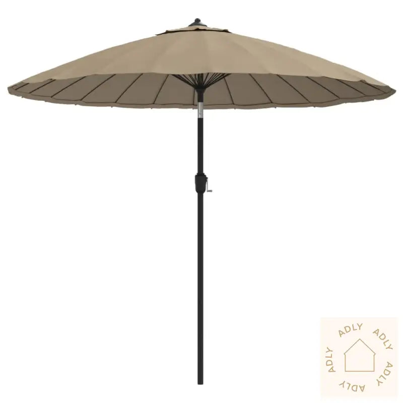 Farge: gråbrunMaterialer: stoff (100% polyester), aluminiumSamlet mål: 270 x 246 cm (Diameter x H)Diameter stang: 38 mmMed sveivesystemInkludert 24 spilerMontering kreves: ja