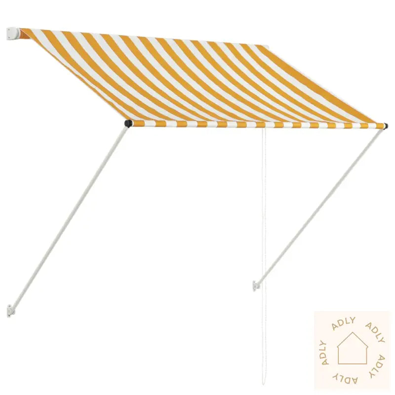 Farger: gul og hvitMaterialer: Stål, 100% polyester med PA-beleggTotale mål: 100 x 150 cm (B x H)Utrekkbar lengde: 0–150 cmManuelt betjentUV- og vannbestandigMontering kreves: ja