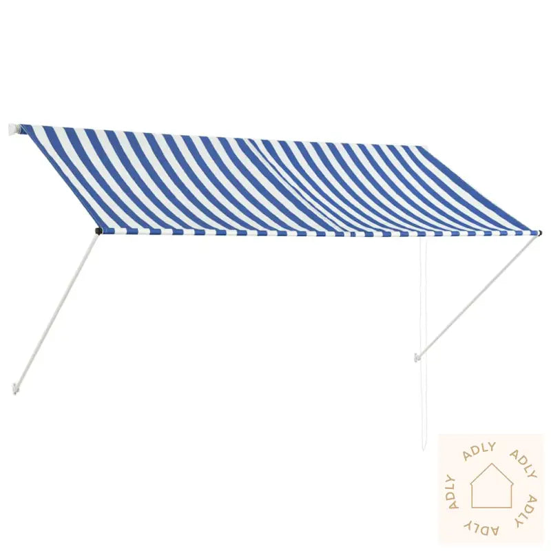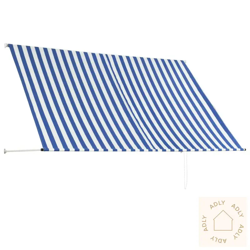 Farger: blå og hvitMaterialer: stålramme og 100% polyesterstoff med PA-beleggVekt stoff: 180 g/m²Mål: 250 x 150 cm (B x H)Lengde uttrekkbar: 0 - 150 cmManuelt betjentUV- og vannbestandig