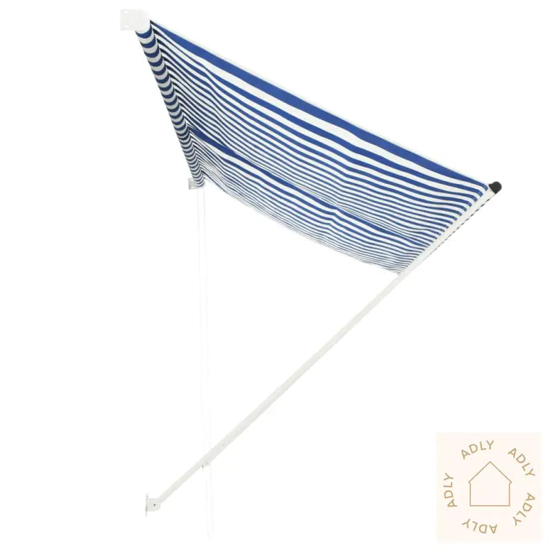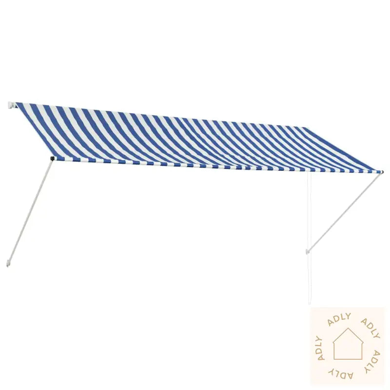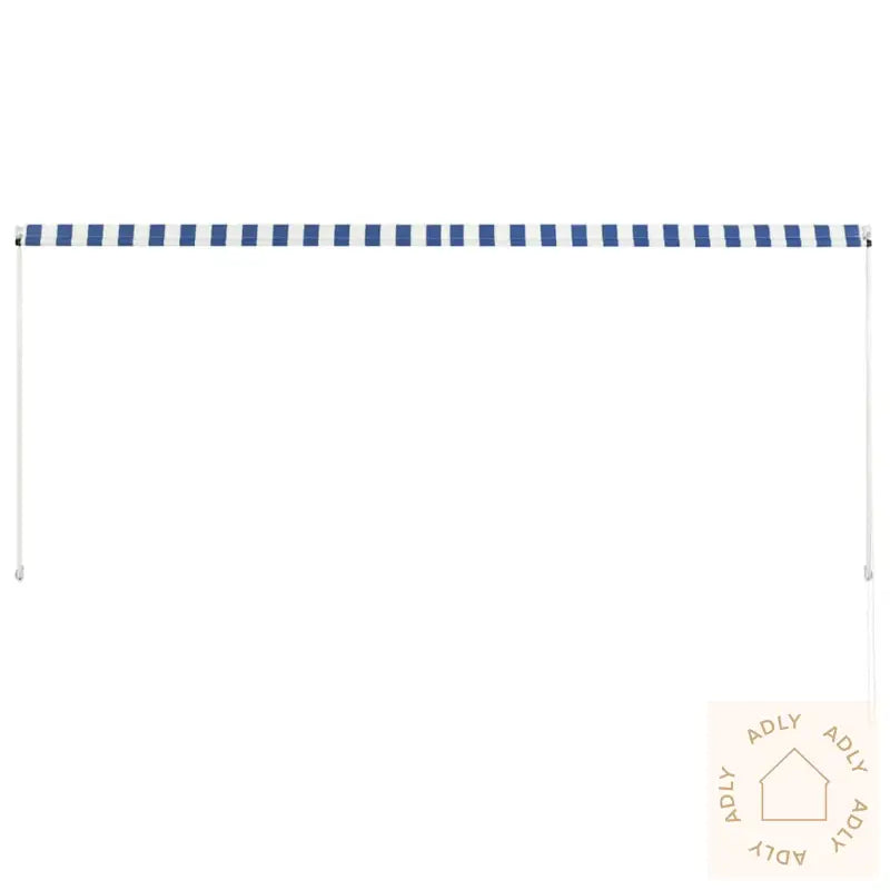 Farger: blå og hvitMaterialer: stålramme og 100% polyesterstoff med PA-beleggVekt stoff: 180 g/m²Samlet mål: 300 x 150 cm (B x H)Lengde uttrekkbar: 0 - 150 cmManuelt betjentUV- og vannbestandig