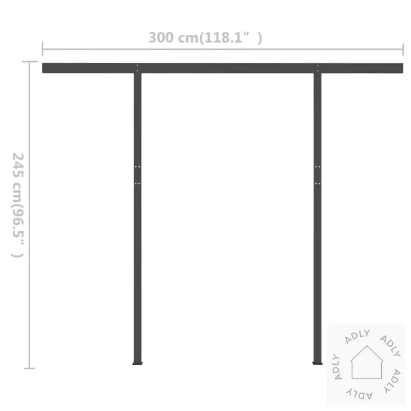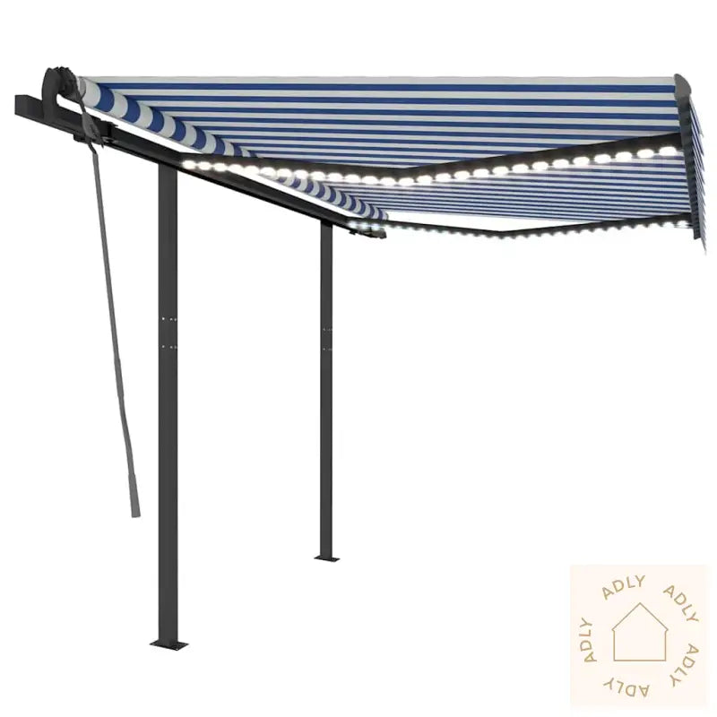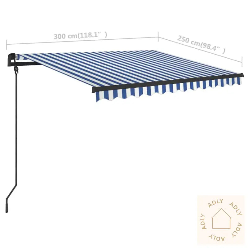 Farge stoff: blå og hvitFarge ramme: antrasittMaterialer: pulverlakkert aluminium, jern, stoff (100% polyester) med PU-beleggSamlet mål: 300 x 250 cm (L x B)Mål stolpe: 300 x 245 cm (B x H)Krever: 3 x 3,7 V batterier (ikke inkludert)Batterikapasitet: 2200 mAhLED-effekt: 3 WLED-spenning: 12 VLED-fargetemperatur: KV3000Montering kreves: ja