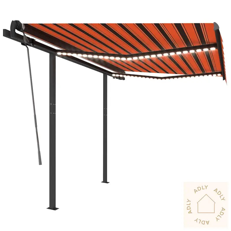 Stoff i stilrene farger: oransje og brunRammestruktur i moderne antrasittMaterialer: pulverlakkert aluminium og jern, slitesterkt stoff (100% polyester) med PU-beleggStørrelse: 350 x 250 cm (L x B)Stolpemål: 300 x 245 cm (B x H)Krever 3 x 3,7 V batterier (ikke inkludert)Batterikapasitet: 2200 mAhLED-lysforbruk: 3 WLED-spenning: 12 VLED-lys, varm fargetemperatur: 3000KMontering må utføres