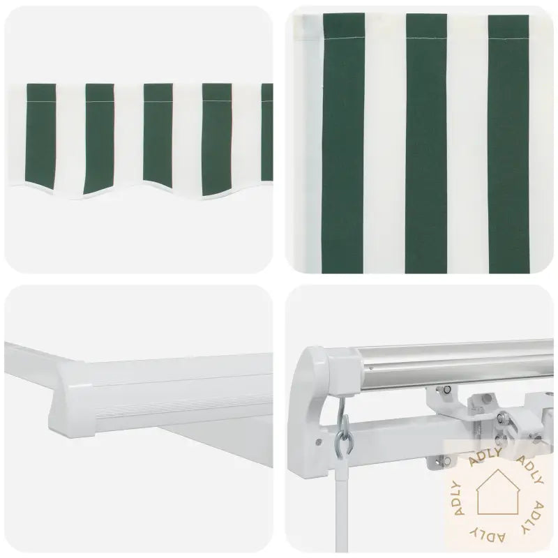 Denne uttrekkbare markisen gir en smart og moderne beskyttelse til uteplassen din, enten det er terrasse eller balkong. Med sitt friske grønne og hvite stripemønster tilfører den ikke bare stil, men skaper også et svalt og behagelig område hvor du kan slappe av eller kose deg med venner og familie. Markisen sørger for at du får maksimal komfort utendørs selv på de varmeste sommerdagene.