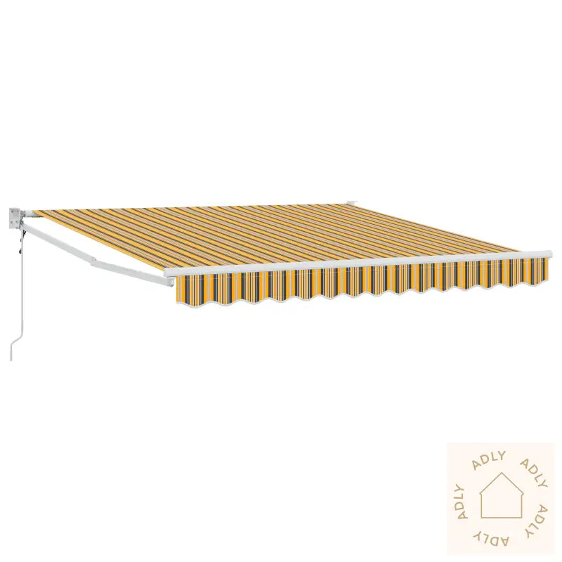 Denne uttrekkbare markisen er en smart løsning for å skape deilig skygge på uteplassen din. Den er lett å trekke ut når sola står på, og skyves enkelt tilbake ved behov. De friske gule og hvite stripene gir et elegant og sommerlig preg, perfekt for alt fra balkonger til terrasser og hager, og passer godt sammen med andre utendørsmøbler og hagemøbler.