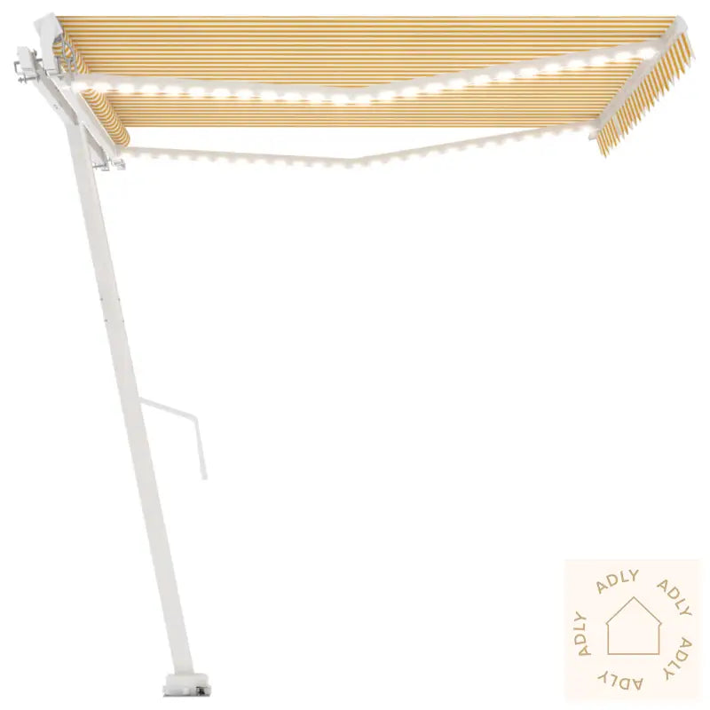 Farger: gul og hvitFarge ramme: hvitMaterialer: pulverlakkert aluminium, 100% polyesterstoff med PU-beleggSamlet mål: 450 x 300 cm (B x H)Mål stolpe: 450 x 245 cm (B x H)Batteri: 3 x 3,7 V (2200 mAh)LED-effekt: 3 WLED-spenning: 12 VLED-fargetemperatur: KV3000Montering kreves: jaSett prikken over i-en på uteplassen din, og kombiner denne markisen med bokhyller og stående hyller for smarte oppbevaringsløsninger – enten du vil skape en hyggelig lesekrok eller ha et sted for pyntegjenstander og blomsterpotter. Gjør området under markisen til et funksjonelt, koselig og stilig samlingspunkt med riktige møbler.