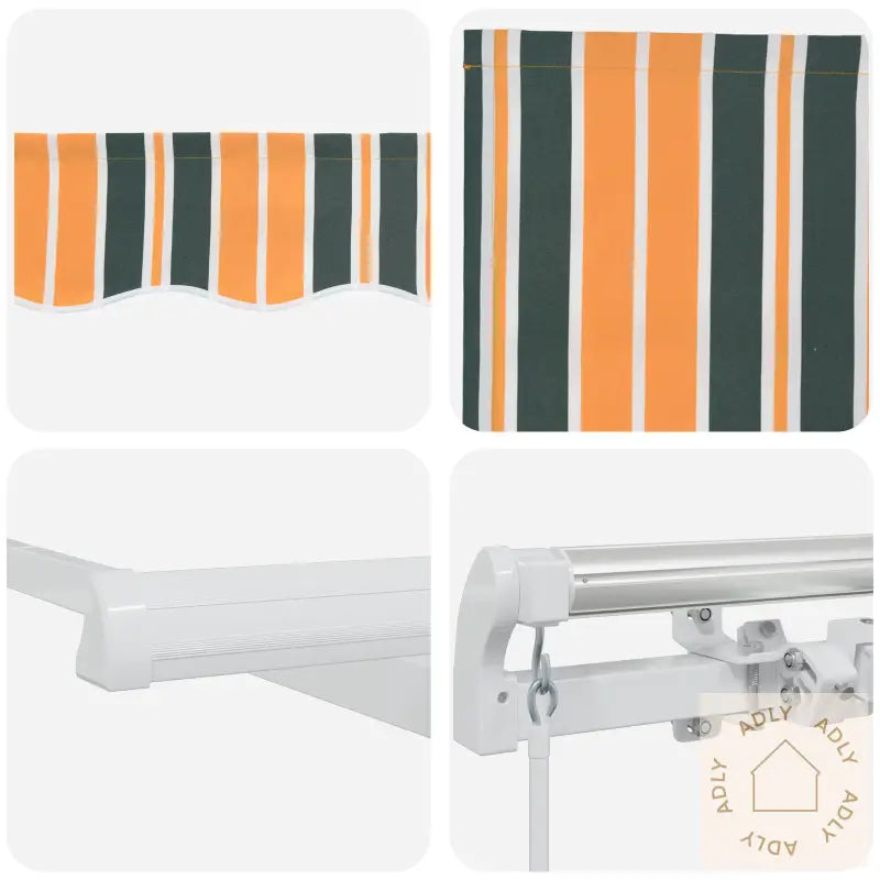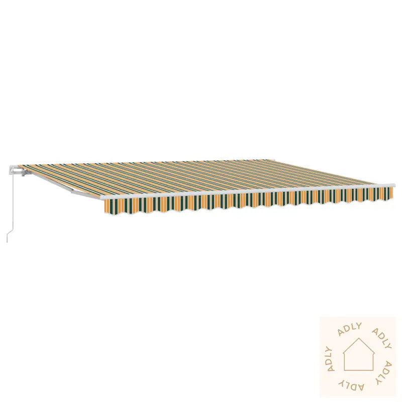 Denne uttrekkbare markisen er akkurat det du trenger når du vil ha en smart måte å skape skygge på uteplassen. Med sitt friske, stripete designet i gule, grønne og oransje nyanser, bringer markisen masse liv og energi til balkongen eller terrassen. I tillegg gir det iøynefallende mønsteret en tidløs, kul look som matcher både moderne og klassiske hagemøbler. Perfekt for deg som ønsker å kombinere stil og funksjon, og bruke mer tid ute – uansett vær.