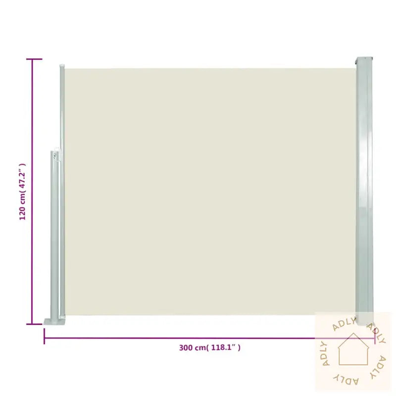 Farger: grønn-grå, kremhvitMaterialer: stålramme, 100% polyesterstoff med PU-beleggVekt stoff: 50 g/m²Mål: 300 x 120 cm (B x H)Høyde stålstang: 120/80 cmLengde uttrekkbar: 0 - 300 cmMotstandsklasse vind: 28 km/tUV-bestandig, slitesterk og vannavstøtendeInkluderer monteringsutstyr
