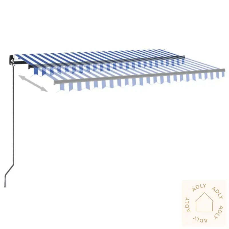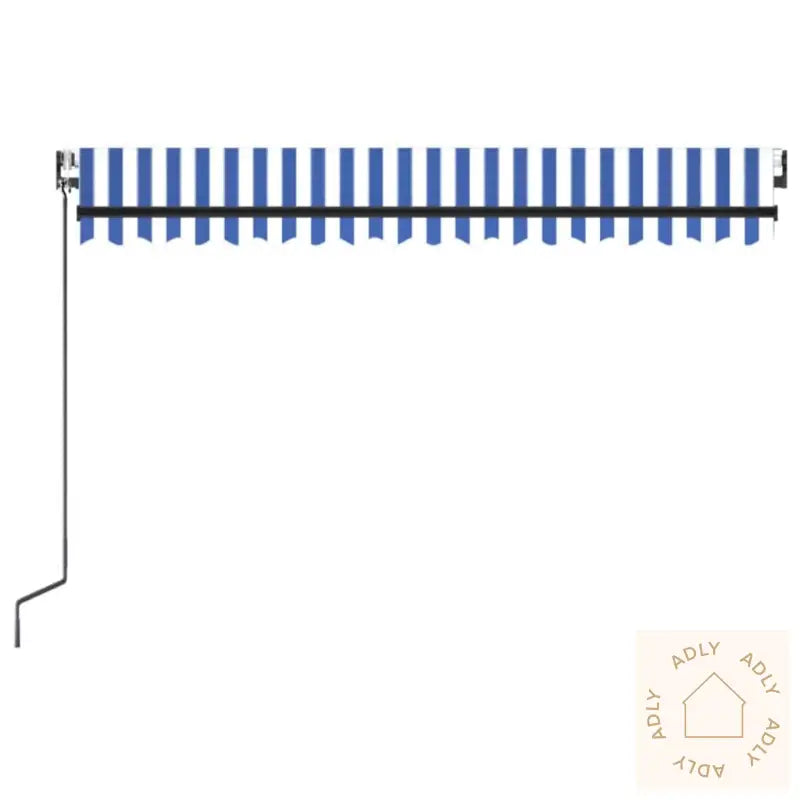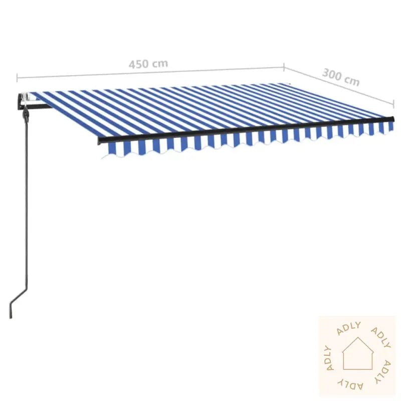 Farge stoff: Blå og hvitFarge ramme: AntrasittMaterialer: Pulverlakkert aluminium, 100% polyesterstoff med PU-beleggSamlet mål: 450 x 300 cm (B x H)Spenning: 230V~ , 0,95A; 50/60 HzEffekt: 226 WMoment: 40 NmHastighet: 13 rpmLED-spenning: 12 VMontering kreves: Ja