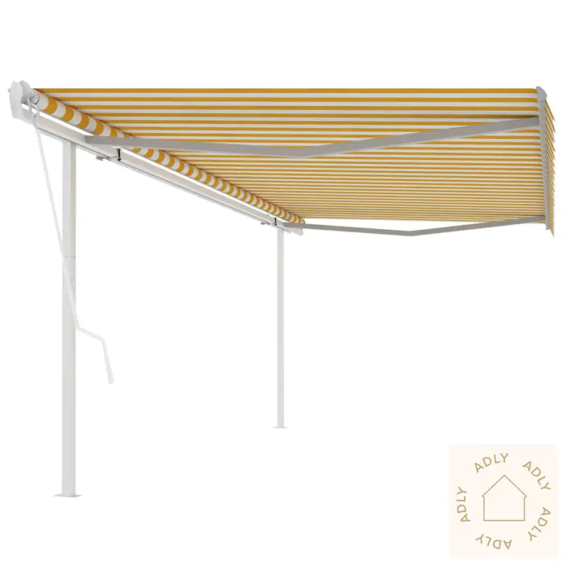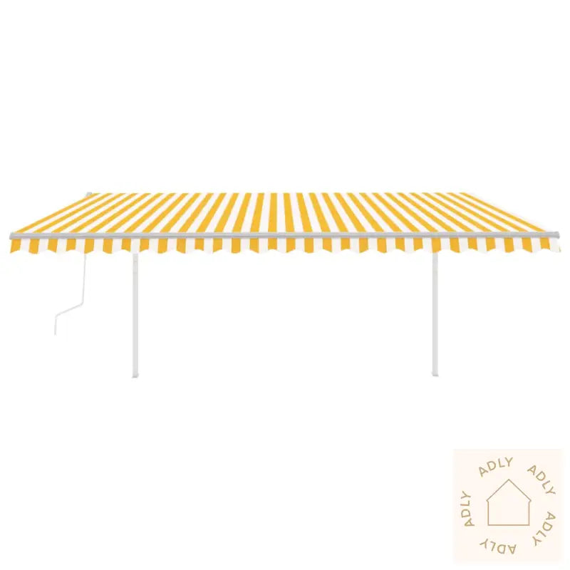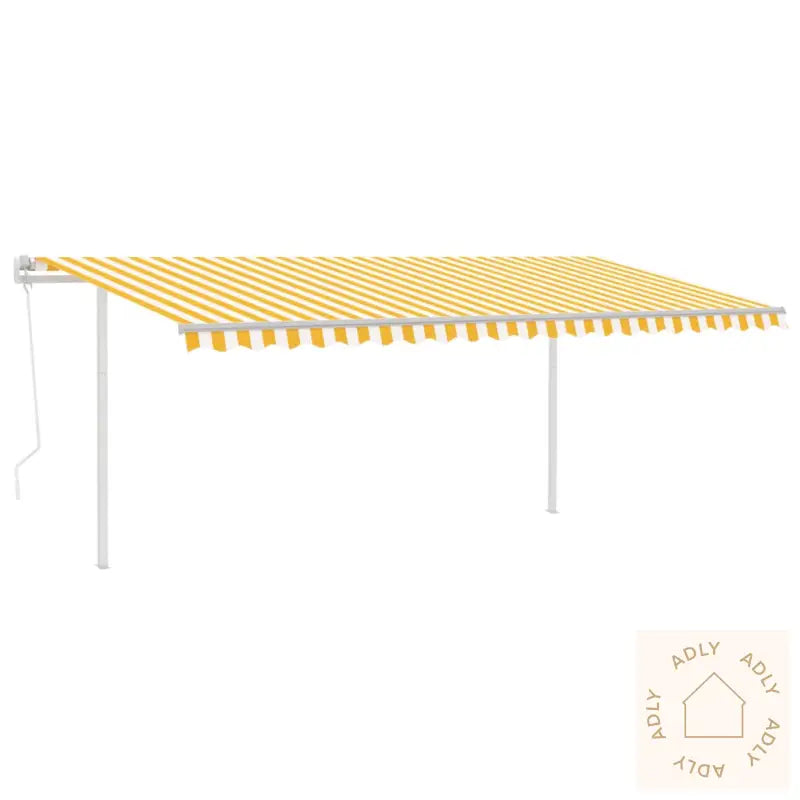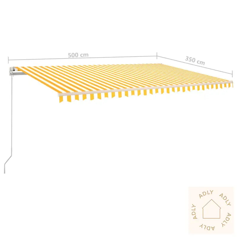 Farger: gul og hvitFarge på ramme: hvitMaterialer: pulverlakkert aluminium, jern, stoff (100% polyester) med PU-beleggSamlet mål: 500 x 350 cm (L x B)Mål stolpe: 450 x 245 cm (B x H)Spenning: 230V~ , 0,95A; 50/60 HzEffekt: 226 WMoment: 40 NmHastighet: 13 rpmMontering kreves: ja