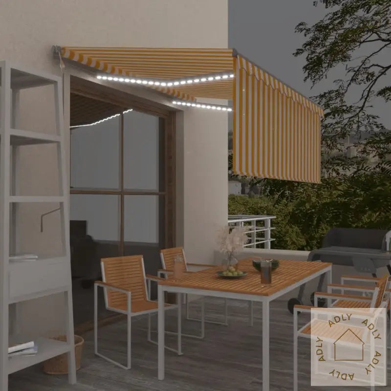 Den uttrekkbare markisen kommer i en stilig gul og hvit farge, mens rammen har moderne antrasittfarge – en kombinasjon som passer perfekt sammen med trendy hagemøbler eller andre møbler til hjemmet. Materialene av høy kvalitet og de smarte funksjonene sørger for at du får mye verdi uansett om du vil slappe av med venner under lyset fra LED-ene, skjerme terrassen eller beskytte verdifulle utemøbler mot vær og vind. Markisen har generøse mål, slik at du får god plass til både loungesett, spisebord og kanskje en av dine favoritt bokhyller og stående hyller til utemiljøet?