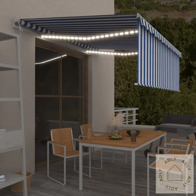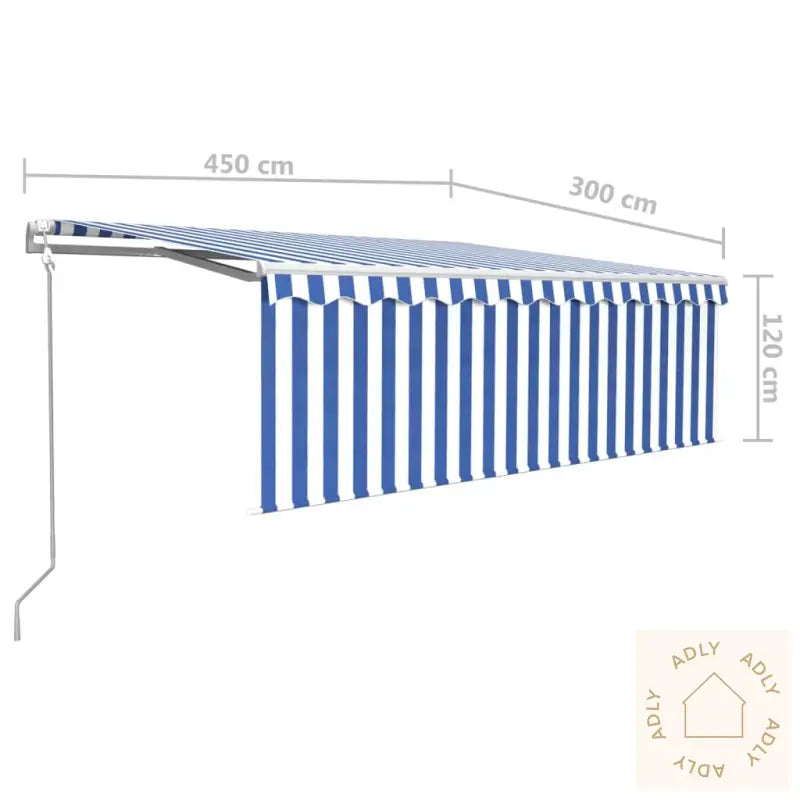 Farger: blå og hvitFarge ramme: hvitMaterialer: pulverlakkert aluminium, 100% polyesterstoff med PU-beleggMål markise: 450 x 300 cm (B x H)Mål rullegardin: 450 x 120 cm (B x H)Spenning: 230V~ , 0,95A; 50/60 HzEffekt: 226 WMoment: 40 NmHastighet: 13 rpmLED-spenning: 12 VMontering kreves: ja