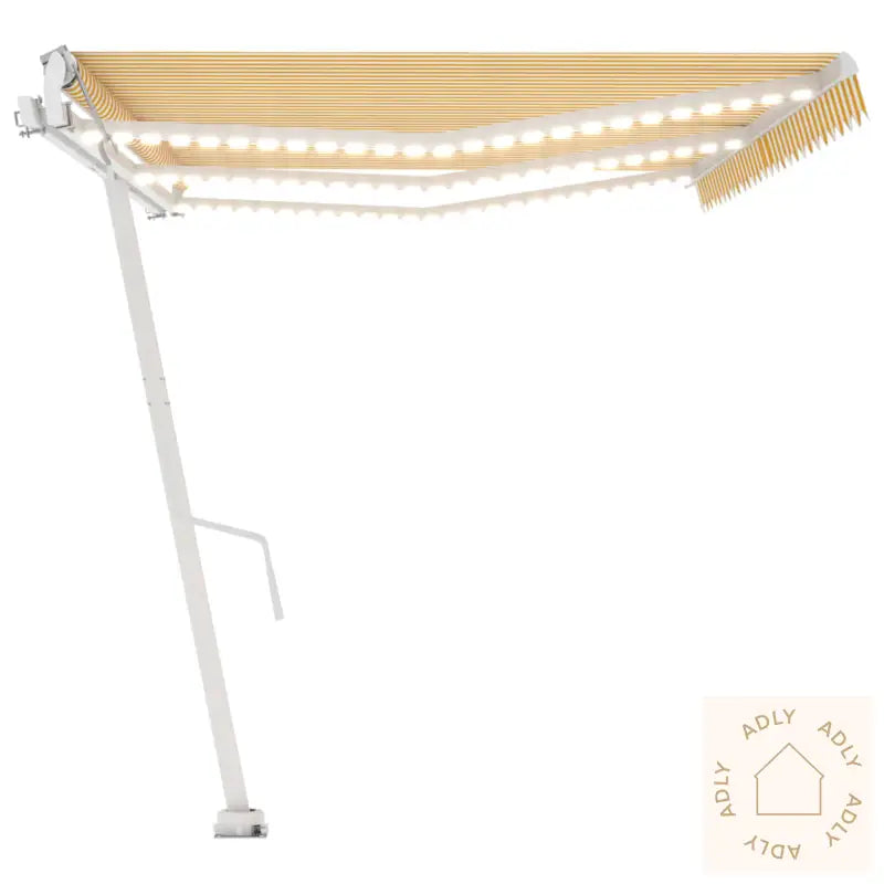 Farger: gul og hvitFarge ramme: hvitMaterialer: pulverlakkert aluminium, 100% polyesterstoff med PU-beleggSamlet mål: 600 x 350 cm (B x H)Mål stolpe: 600 x 245 cm (B x H)Spenning: 230V~, 0,95A; 50/60 HzEffekt: 226 WMoment: 40 NmHastighet: 13 rpmLED-spenning: 12 VMontering kreves: ja