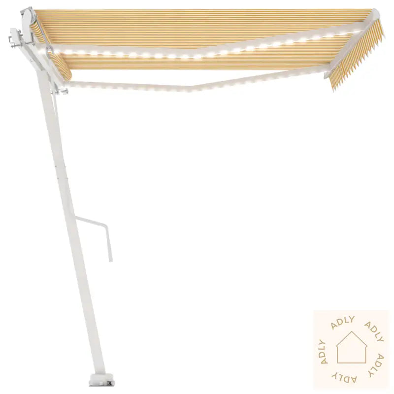 Farger: gul og hvitFarge på ramme: hvitMateriale: pulverlakkert aluminium, 100% polyesterstoff med PU-beleggSamlet mål: 400 x 350 cm (B x H)Mål på stolpe: 450 x 245 cm (B x H)Spenning: 230V~ , 0,68A; 50/60 HzEffekt: 155 WMoment: 20 NmHastighet: 13 rpmLED-spenning: 12 VMontering kreves: ja